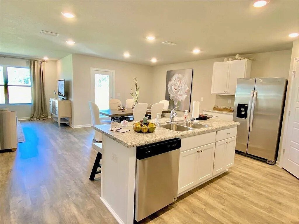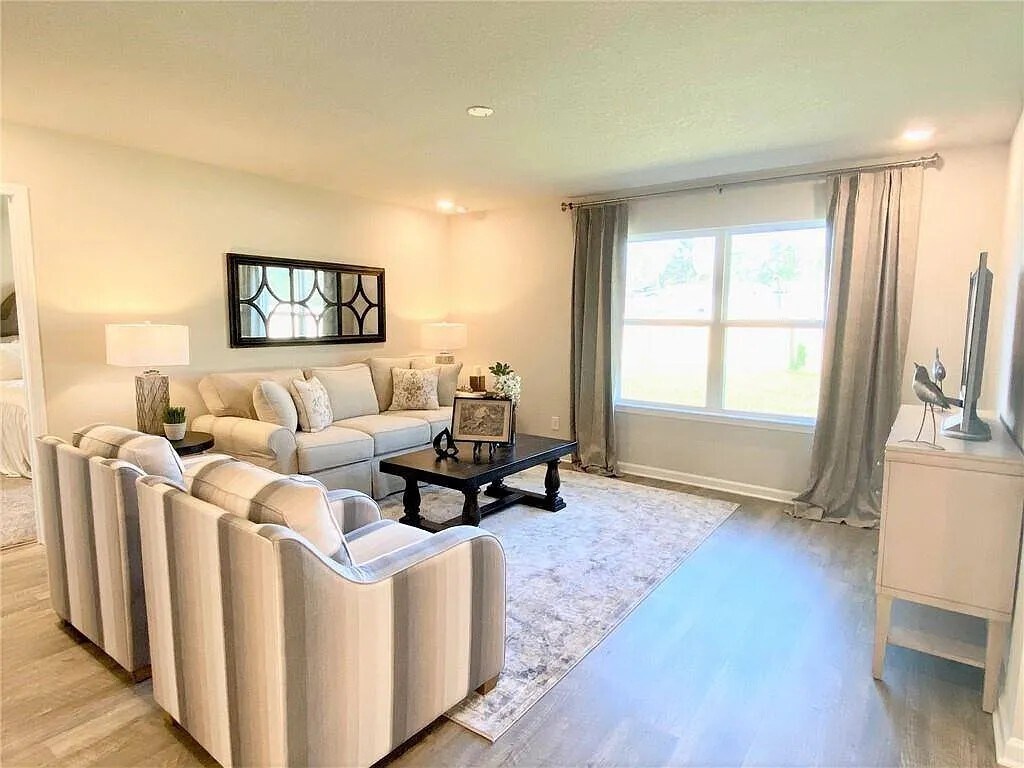 This spacious 4-bedroom, 2-bath home offers a popular open floor plan, perfect for comfortable living and entertaining. The kitchen features granite countertops, stainless steel appliances, elegant cabinetry, and a large island for extra prep and dining space. Luxury vinyl plank flooring runs through the main living areas, while plush carpet adds comfort to the bedrooms. Enjoy the covered back porch for outdoor relaxation and the convenience of a two-car garage. Community amenities include access to a refreshing pool. This home also comes with a Smart Home system that includes a Kwikset front door lock, SkyBell video doorbell, smart light switch, Honeywell thermostat, and an Amazon Echo Dot—allowing you to control locks, lights, and temperature with ease from your smartphone or by voice command. Available December 1, 2025 – schedule your showing today! Photos are for advertising purposes only and may not represent the exact home.