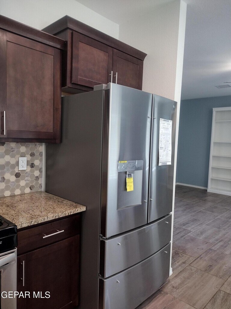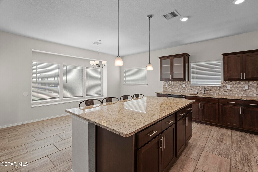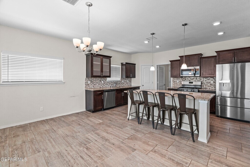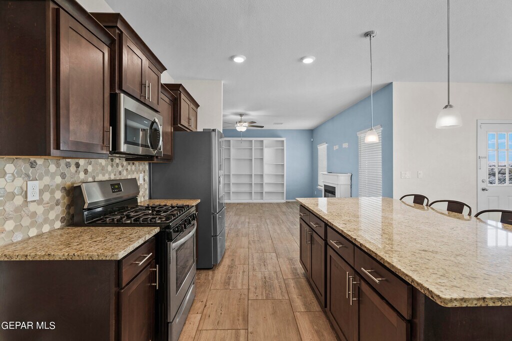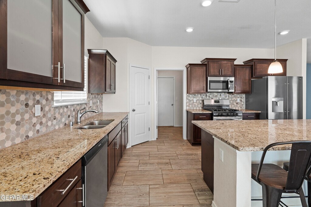 New Summer Sky Neighborhood built in 2022! Move In Ready Now! Your family & Pets will enjoy this 2 story,4 beds,2.5 baths. Impressive entrance to formal large living room w/built in shelves. High ceilings & bright windows all around. Kitchen has large granite island w/ bar stools included,deep sink,dishwasher,range/oven,microwave & extra large pantry. Breakfast/Dining area. room enough for large dining table. Convenient Restroom downstairs. Upstairs has all 4 bedrooms. The hall bathroom has double sink vanity & privacy door to toilet. Master Bedroom has a grand balcony outside to view the beautiful southwest sunset. Master Bath has double sink vanity,shower and garden tub. Plenty of coat & linen closets. Utility Room w/shelves for your washer and dryer. Double Car Garage,2 Refrigerated Air Units to save energy. Easy care landscape Amazon Blink Cameras w/your account. close distance to Beautiful Summer Sky Park. Access to I-10,Loop 375. You'll enjoy your life here!