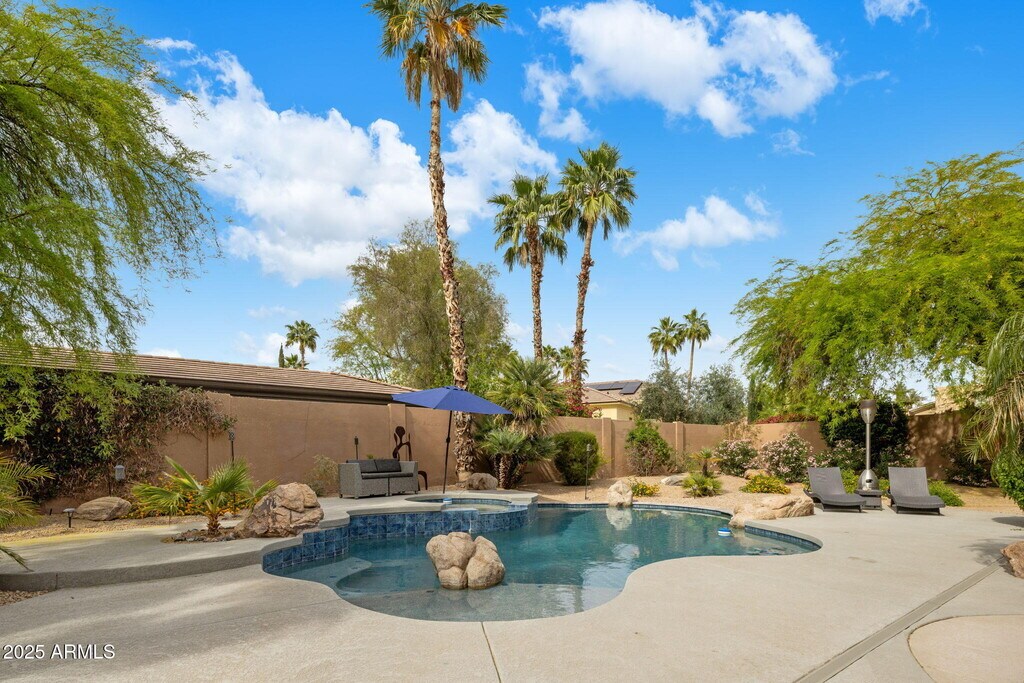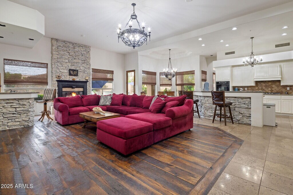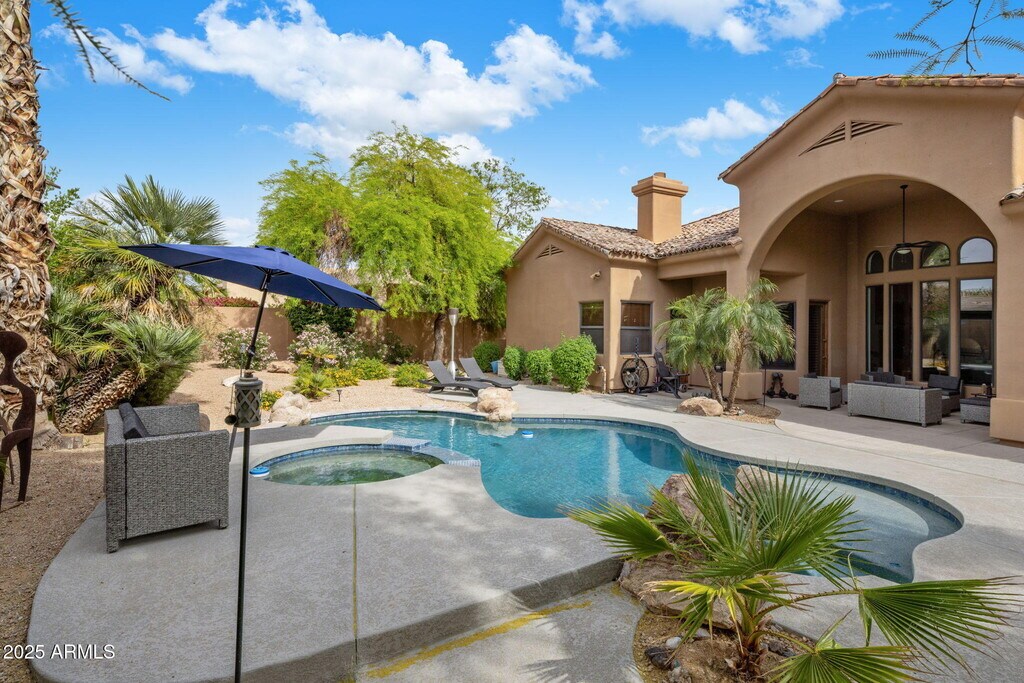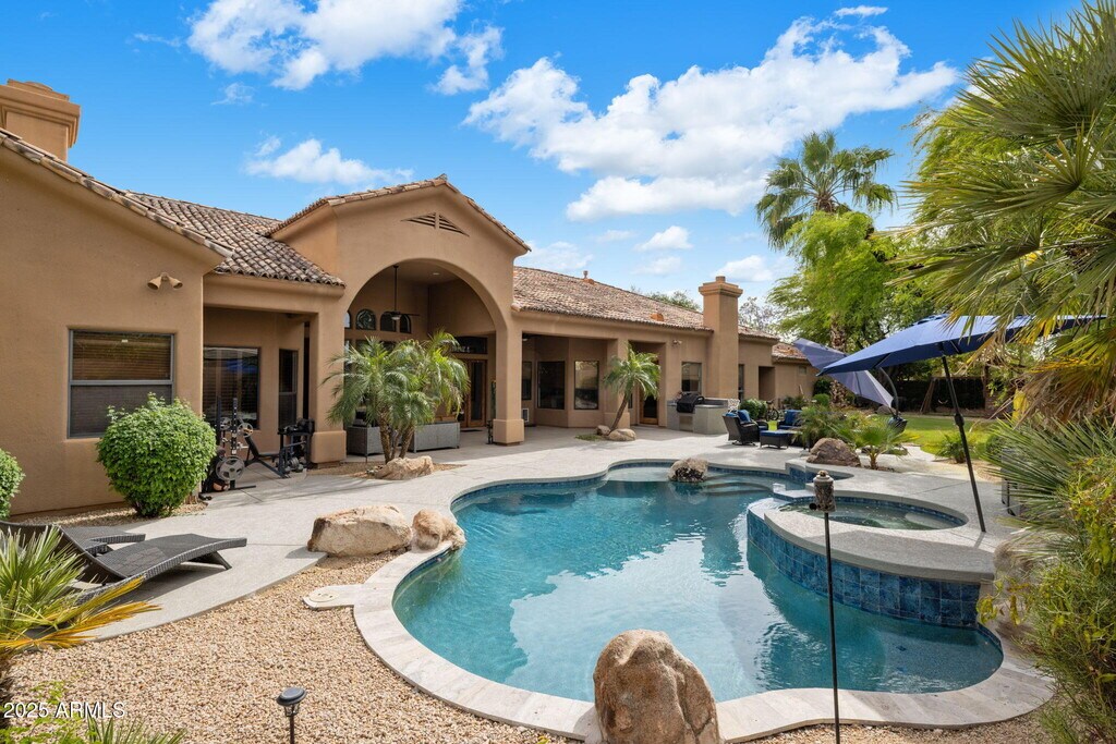 Welcome to Saddle Rock Ranch,an exclusive enclave of custom homes nestled in the highly sought-after 85259 zip code. This beautifully custom home sits on a desirable north-south lot surrounded by mature landscaping. It offers four spacious ensuite bedrooms,including a luxurious master suite featuring a stone fireplace and a versatile bonus roomperfect for a home office or gym. The open-concept kitchen flows seamlessly into a large family room complete with a wet bar,stone fireplace,and rustic reclaimed wood flooring. An additional media/bonus room boasts wood-beamed ceilings,hardwood floors,and a built-in refreshment centerideal for entertaining. Step outside to a private backyard with a built-in BBQ,a sparkling pool with spa. Community Tennis courts