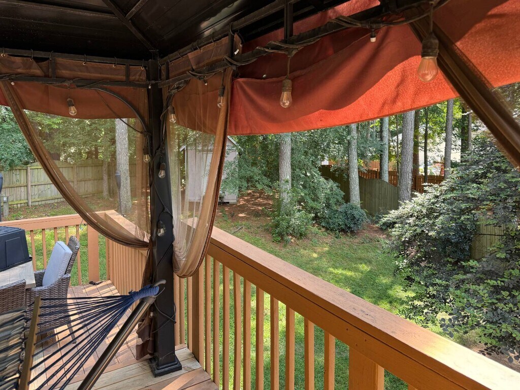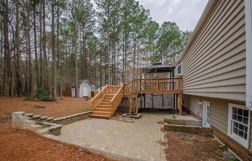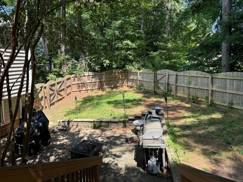 Welcome to 109 Carmel Woods Court, a five bedroom, three bath home in the well-established Cimarron subdivision of Wake Forest. Set on a quiet cul-de-sac, this two story layout combines usable space, updated finishes and outdoor living areas that elevate day-to-day life.The main floor features an open dining and living area with vaulted ceilings, natural light and a clean flow into the kitchen. The kitchen includes granite counters, stainless steel appliances, track lighting and plenty of cabinet space. Textured ceilings and warm-toned flooring add character throughout this level. Downstairs, a full second living space gives the home real flexibility. This level features a natural gas fireplace that anchors the room, creating a true lounge, media or multi-use area. The downstairs layout includes two bedrooms, a full bath and easy access to the laundry room and exterior door. All five bedrooms offer functional layouts, and three full baths make daily routines easier for multiple occupants. Outdoor living stands out. Stepping out to the deck, complete with a covered pagoda that adds shade and a screened feel without enclosing the space. The wooded, fenced yard creates privacy and includes a storage shed, a stone patio and a fire pit area that makes fall evenings feel different in the best way. Living in Cimarron means access to a swim and tennis community, established streets and a familiar neighborhood feel. Wake Forest adds walk-able downtown spots, local restaurants and the charm the town is known for. Parks, greenways, schools and everyday conveniences are close by, and Falls Lake is moments away for hiking, boating and outdoor recreation. Rental requirements include a minimum credit score of 625, verifiable income of at least 2.5x the monthly rent, pass background check, and no prior evictions. The first month's rent, security deposit and processing fee is due at lease signing.