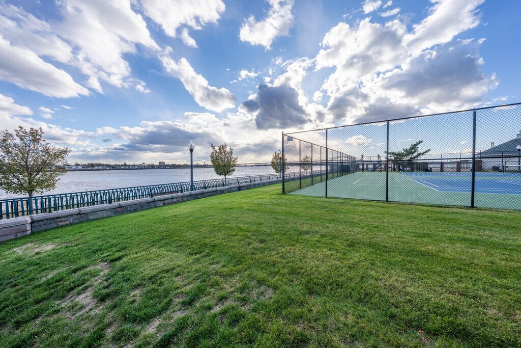 Step into this stunning 2-bedroom, 2-bathroom rental, located on the first floor of the desirable gated Society Hill community in Jersey City. Featuring hardwood floors throughout the living areas this home combines style and comfort. Enjoy peaceful views of the bay from your private terrace, an ideal spot for relaxation or entertaining. The spacious primary bedroom offers an ensuite bathroom and a generous walk-in closet, with a closet organizer. The kitchen is well-equipped with ample counter space, and the sunny dining nook creates a warm, inviting atmosphere. Added convenience of an in-unit washer and dryer and central HVAC. There is also a designated parking spot for one car with ample guest parking. Society Hill residents enjoy a range of amenities, including 24-hour security, an outdoor pool, a community room, a play area, and tennis courts. Experience the perfect blend of comfort and convenience in this lovely rental home. Schedule a tour today!