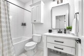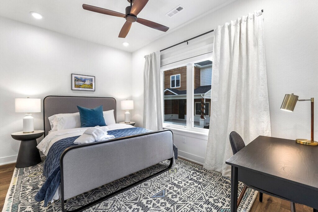 Get ready to hit the town from this newly built, modern getaway, with easy and walkable access to all of your Bentonville favorites! Located in the heart of Bentonville, this Ozark Oasis is within just a few minutes of Downtown Bentonville, Crystal Bridges, The Momentary, and offers a quick ride to NWA's premier MTB bike trails. This 4-bedroom, 3-bathroom home has all of the amenities needed for a relaxing stay for up to 10 people. Highlights include being just 0.5 miles from the Razorback Greenway, NWA's premier biking, running, and walking path, and 0.5 miles from Slaughter Pen Trail. The home is 0.6 miles from Downtown Bentonville, making it easily walkable, and is 2 miles by car or 0.4 miles on foot from Crystal Bridges and The Momentary. The house is MTB-friendly, with all of the Bentonville trails easily accessible. Newly built with modern details and amenities, the open concept living, kitchen, and dining area is perfect for gatherings. The home sleeps 10 with 5 beds, including two king-size beds, two twin bunk beds, and a queen-size bed. Enjoy heated floors in the primary bathroom, a patio with an outdoor dining table, BBQ grill, small grass space, and a privacy fence. A fully equipped laundry room, board games, and playing cards are provided. The home is kid-friendly with a Pack 'n Play and children’s dinnerware available. Parking is available for up to 4 cars, including 2 in the garage. This property offers parking for up to 4 cars, including 2 in the garage. When you enter the home, you'll immediately step into the open concept living room, a favorite spot with its natural wood finishes, cozy seating, gas fireplace, and access to the fenced-in patio. The living area features a comfy oversized chaise sofa, a leather lounge chair, a 60-inch Samsung Smart TV, and an electric fireplace, making it the perfect place to relax after a day on the town. The dining area includes an oval, 6-top dining table, ideal for meals and conversation. The kitchen is fully stocked with ample amenities, brand-new appliances, a gas stove, a combination single serve/drip coffee pot, and plenty of built-in storage. The large island hosts the sink and three barstools. At the end of the day, settle into one of the five luxury beds. Upstairs, the primary bedroom features a king-size bed, two closets, a dresser, lounge chair, a 60-inch Smart TV, and a huge en-suite bath with heated floors and a dual shower head walk-in shower. The second bedroom has a king-size bed, closet, and nearby bath. The third bedroom includes two twin-size bunk beds, sleeping four people total, a closet, and a nearby bath. Downstairs, the fourth bedroom has a queen-size bed, desk area, closet, and nearby bath. The patio area, accessible through sliding glass doors in the living room, is fenced in and features a large outdoor dining table and a grill for outdoor gatherings. The property is not pet-friendly, and pets discovered at the property will incur a fine of $400. No parties or events are allowed unless pre-arranged with the host and the event fee has been paid. Unapproved parties or events will result in a $1000 fine. Unauthorized checkout delays will incur a fine of $100 per hour. This is a non-smoking home, and smoking inside will result in a $1000 fine plus the cost of any smoke remediation necessary. Quiet hours are between 22:00 and 10:00. Check-in is any time after 3:00 PM. [SI]