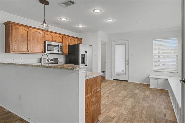 Marcy BarkemeyerCharming single-story home nestled on a quiet, tree-lined neighborhood with family friendly amenities. This three-bedroom, two-bath home in Fort Worth is available for LEASE. An inviting open-concept layout creates an effortless flow from the living area into the kitchen and breakfast nook perfect for everyday living and entertaining. Ample natural light floods the living space, highlighting beautiful low-maintenance wood-look tile that extends through the common areas. The kitchen features granite countertops, a gas range, and stainless steel appliances. The primary suite offers a peaceful retreat with generous closet space and an ensuite bath. Two additional well-proportioned carpeted bedrooms and a second full bath provide comfort and flexibility for family, guests, or a home office. Practical exterior features include a two-car garage with alley access for rear entry and the convenience of an EV-ready Tesla charger already installed. The low maintenance backyard yard is ideal for play, pets or simple outdoor relaxation. This community offers lifestyle amenities that families love: a community pool for hot summer days, a playground, peaceful pond, and walking trails that encourage an active, outdoor lifestyle. Zoned to Eagle Mountain Saginaw ISD, the location is perfect for growing families. Close to Alliance area s dining and retail options, with Eagle Mountain Lake nearby for weekend recreation and water activities. Meticulously maintained home delivers the blend of style, comfort and family amenities for a qualified tenant. Dog breed restrictions include: Pit bull, Rottweiler, Chow, Doberman.
