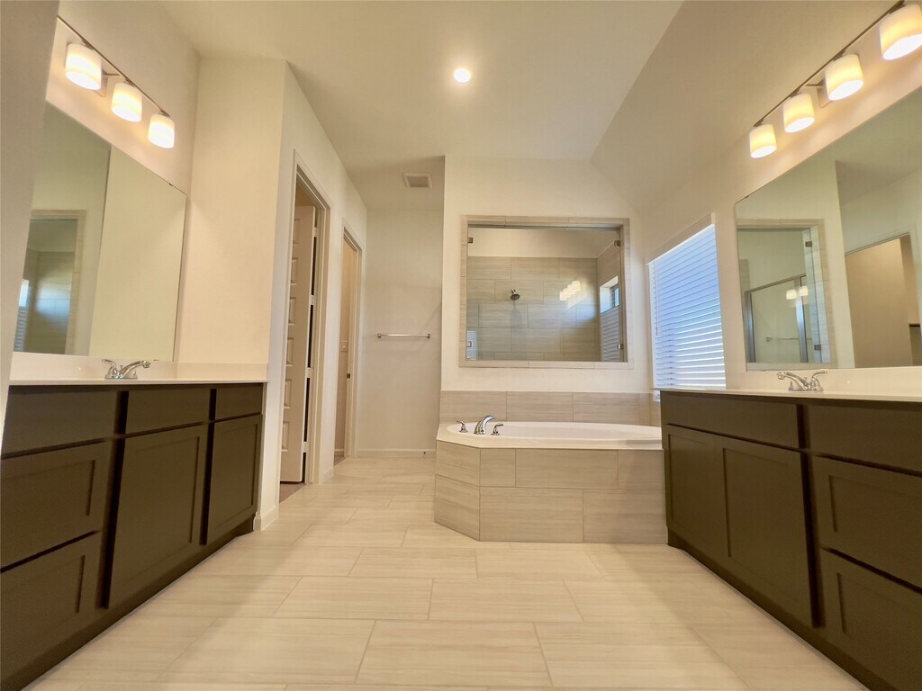 Home office with French doors set at entry with 12-foot coffered ceiling. Open kitchen features generous counter space,5-burner gas cooktop,corner walk-in pantry and island with built-in seating space. Dining area flows into open family room with wall of windows. Primary suite includes bedroom with wall of windows. Dual vanities,corner garden tub,separate glass-enclosed shower and two walk-in closets in primary bath. A guest suite with private bath adds to this four-bedroom design. Covered backyard patio. Mud room off two-car garage. MLS# 97582611