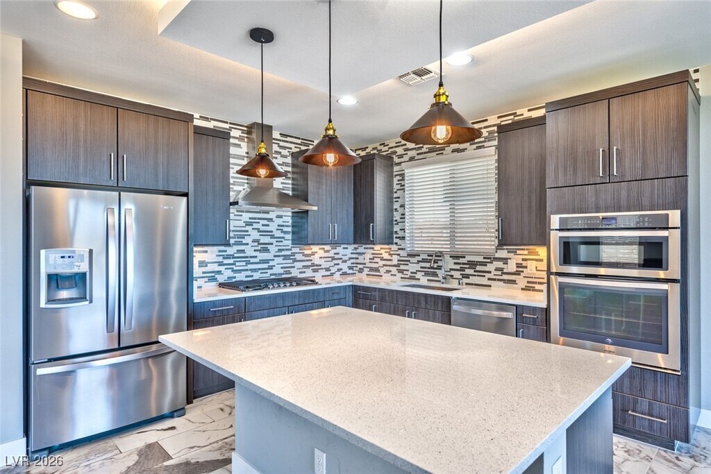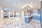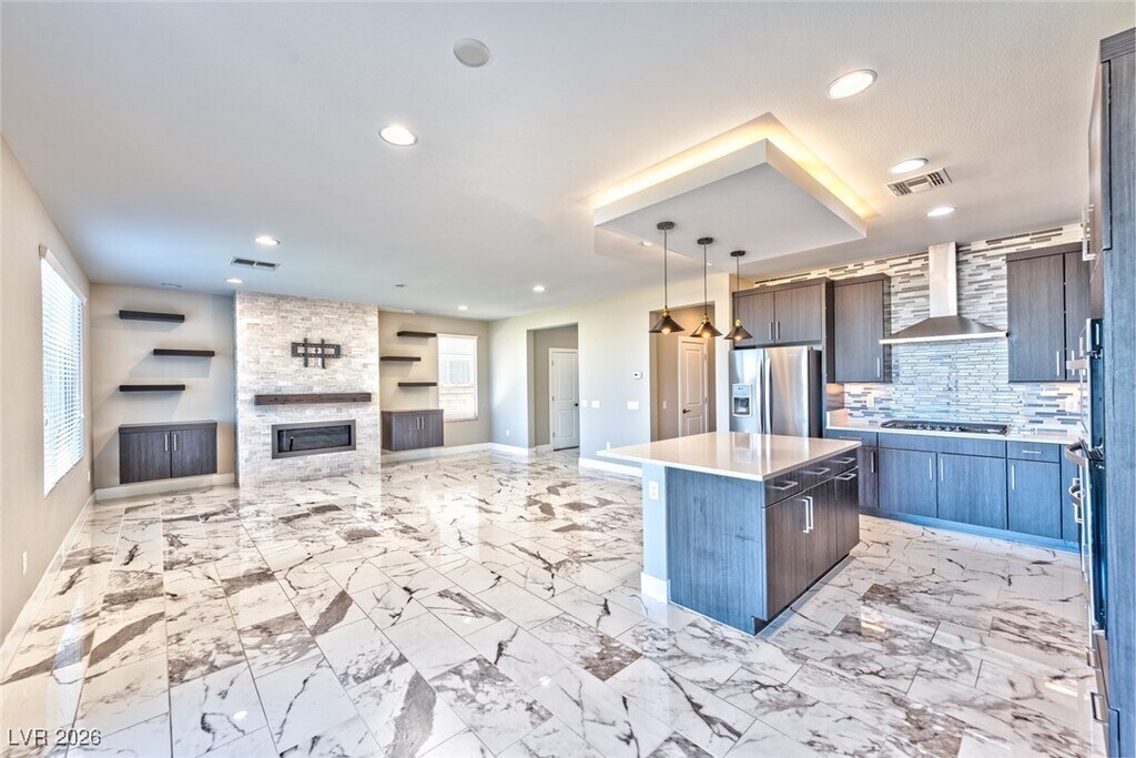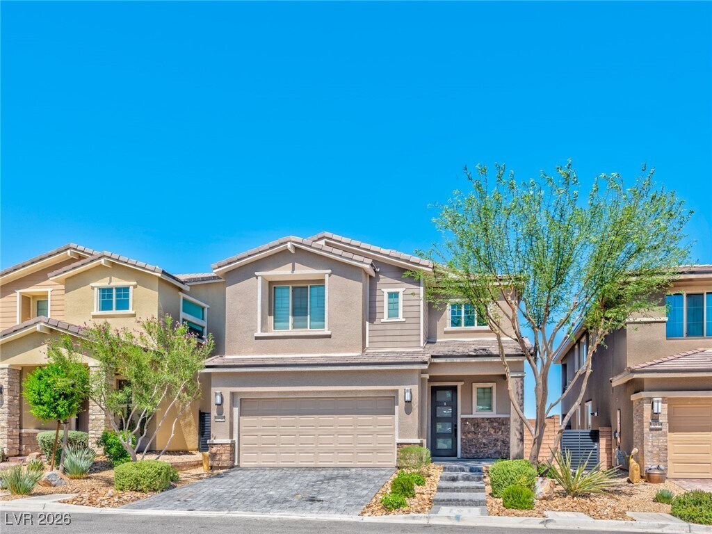 Beautiful gated home in the highly sought-after Summerlin Reverence community. This newer residence showcases extensive upgrades throughout. The gourmet kitchen features quartz countertops, a large island with breakfast bar, upgraded cabinetry, tile backsplash, pendant lighting, stainless steel appliances, and recessed lighting. The inviting family room offers a custom stone accent fireplace, built-in cabinetry, and floating wood shelves. Upstairs includes a spacious loft with TV mount and a convenient laundry room. The primary suite boasts a private balcony with stunning views of the mountains, city, and Las Vegas Strip. The spa-inspired primary bathroom includes a luxurious walk-in shower, dual sinks with quartz counters, upgraded fixtures, and a large walk-in closet. Enjoy the serene backyard with unobstructed mountain, city, and Strip views, complete with low-maintenance desert landscaping, pavers, and artificial turf.