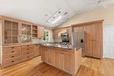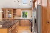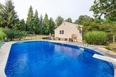 Call for Availability - This beautifully maintained home sits on a sought-after cul-de-sac within walking distance to Long Lots, Bedford, and Staples. Set on 1.2 acres of lawn and gardens, the open-concept interior features soaring ceilings, skylights, and hardwood floors. The updated kitchen boasts granite counters, brand new Miele appliances, and a sunny den with built-ins and patio access. Four bedrooms include a spacious primary suite with a renovated bath, steam shower, custom cabinetry, and French doors. Enjoy single-level living plus a finished basement with fireplace, built-ins, and a versatile room with a billiard table. Outside, a bluestone patio leads to a landscaped pool, outdoor shower, and enclosed raised-bed vegetable garden. Extras include central air, a whole-house Generac generator, Tesla charger, solar panels that provide enough power to cover all electric bills, Optimum Fiber internet and Ring camera. The home is very energy efficient, making the running costs very low. Available through August 15, 2026 MLS# 24116928