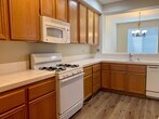 Beautiful townhome with a flexible third bedroom downstairs. Downstairs room does not have a closet. The main living area has gorgeous luxury vinyl and a warm and inviting fireplace. The kitchen is complete with a gas range, tile countertops, and a charming breakfast nook. For added convenience, the home includes an inside laundry area and full bathrooms both upstairs and downstairs. The spacious primary suite offers a true retreat with its luxurious oval soaking tub, separate shower, and a generously sized closet. Additional highlights include direct access to a two-car garage with an automatic roll-up door, plus ample guest parking conveniently located just steps from your front door. Residents also enjoy access to a community clubhouse, pool, and spa for resort-style living.
