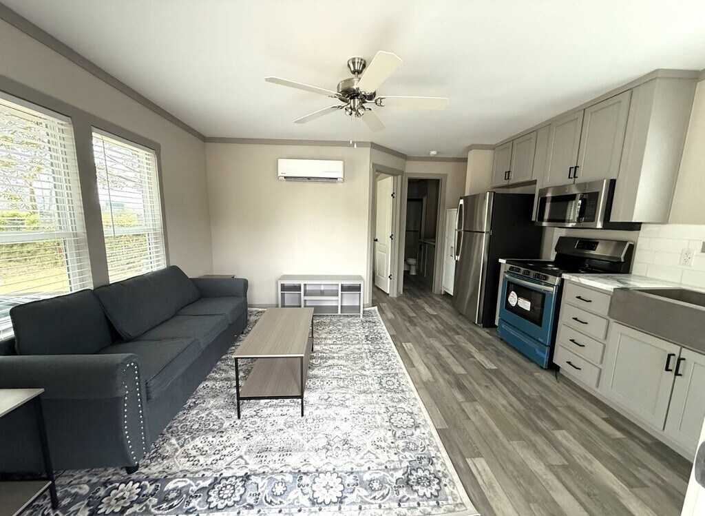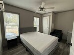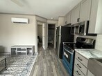 Step into modern tiny home living in the heart of Austin at Royal Palms Manufactured Home Community. This brand-new 2025 Marathon Homes Chapman model offers comfortable living in 400 sq. ft. with a 6'x15' covered porch perfect for morning coffee, evening relaxation, or entertaining friends. Designed for full-time living, this home comes fully furnished and move-in ready. Inside, you'll find a bright open layout with a full kitchen-complete with stainless steel refrigerator, LP stove/oven, and a stainless-steel farmhouse sink. The spacious living area includes a sleeper sofa with a queen mattress, a dining table for four, coffee table, end tables, media console, area rug, and a 43" Roku TV. The bedroom features a queen platform bed with a 10" mattress, built-in chest of drawers, nightstand, cushioned chair, and an additional 43" Roku TV for cozy nights in. A walk-in shower and efficient layout make everyday living easy. Outside, enjoy your covered porch furnished with two wicker rocking chairs and table, plus an outdoor area rug-ideal for relaxing in Austin's warm weather. Located minutes from downtown Austin, Royal Palms offers convenience, comfort, and a welcoming community feel. Whether you're downsizing, investing, or looking for a stylish home base close to the city, this tiny home is ready when you are.