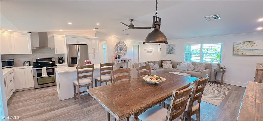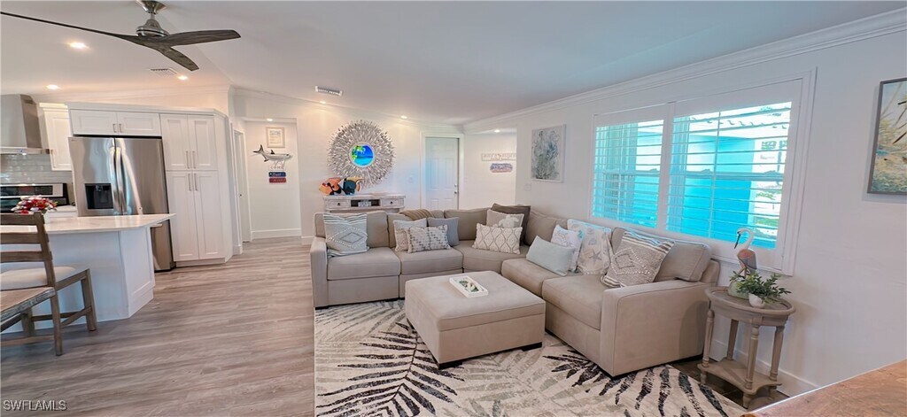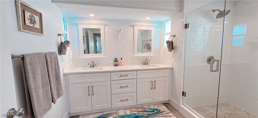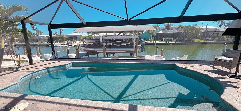 Imagine stepping into a beautifully designed coastal retreat in Fort Myers Beach,perfectly situated on a serene wide canal with direct Gulf access. This stunning home blends modern luxury with coastal charm,offering a seamless indoor-outdoor living experience. As you approach,lush tropical landscaping and swaying palm trees create a warm welcome. The backyard is a true waterfront oasis,featuring a private pontoon/boat dock with a brand-new lift and canopy,perfect for protecting your boat from the Florida sun. A spacious patio with a covered lanai offers the ideal setting for alfresco dining,ample grilling space,comfortable lounge seating,and breathtaking sunset views over the water. Step inside to an open-concept living space flooded with natural light.Vaulted ceilings in living area,recessed lighting,and wide-plank wood looking tile flooring set the stage for elegance and comfort. Coastal-inspired furnishings in soft blues,sandy neutrals,and crisp whites create a serene atmosphere,while custom shiplap walls,woven textures,and driftwood accents add a touch of rustic sophistication. The gourmet kitchen is a chef’s dream,boasting quartz countertops,stainless steel appliances,a large island with bar seating,and white shaker cabinets. Pendant lighting and a tiled backsplash add the perfect coastal flair. The primary suite is a tranquil retreat with large windows overlooking the water,en-suite bath featuring a walk-in r shower,double vanity. Additional bedrooms are equally well-appointed,each with cozy bedding,beachy decor,and ample closet space—ideal for family and guests. Extras & Upgrades • Security cameras • Heated pool • Outdoor shower for rinsing off after a day on the water • Two-car garage with ample storage for beach and boating gear This coastal paradise is not just a home—it’s a lifestyle,offering the best of boating,beach living,and modern luxury just moments from the Gulf .