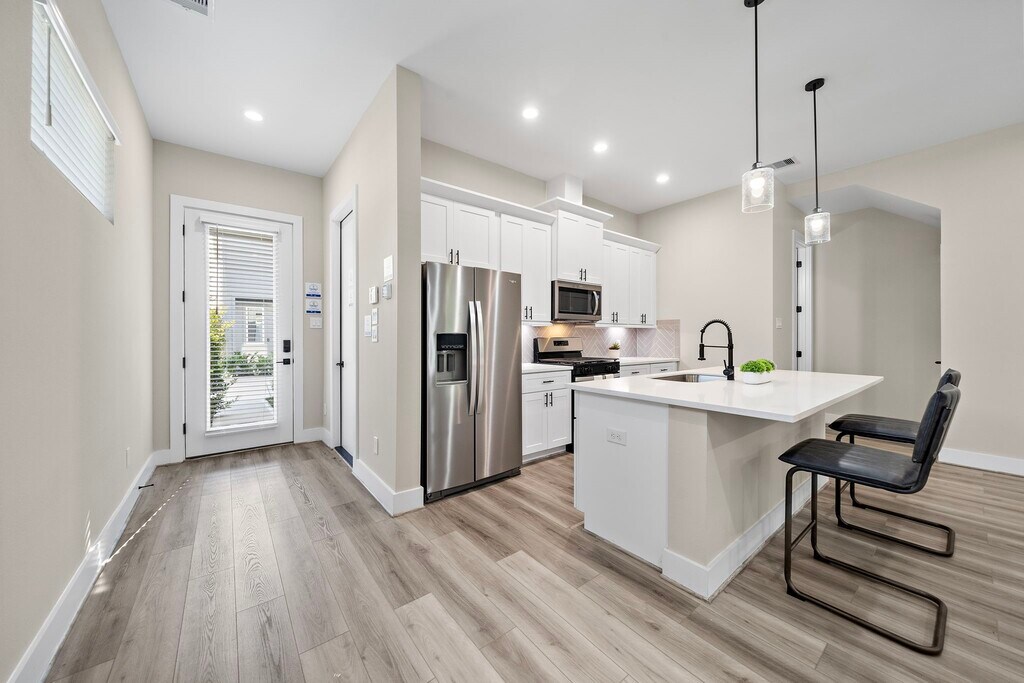 This is a new construction 3 bedroom,2.5 bathroom home located in the Greater Independence Heights Area . Being located 9 minutes from Downtown Houston,the home offers easy access to the Inner 610 Loop amenities and green spaces. The home features an open floor plan with high ceiling,with the living room,kitchen,and dining area flowing seamlessly together. The home boasts of vinyl plank flooring throughout the living areas,providing a durable and low maintenance option for a busy family. The kitchen has modern appliances and ample counter space,perfect for cooking and entertaining. Luxurious primary bathroom a walk in shower with a bench,perfect for unwinding after a long day. The primary bedroom also features a large walk-in closet,providing ample storage space for clothes and personal items. The easy to maintain backyard is great for grilling with friends or playing with your pets. This home is in a gated community,offering added security and privacy. MLS# 49138769