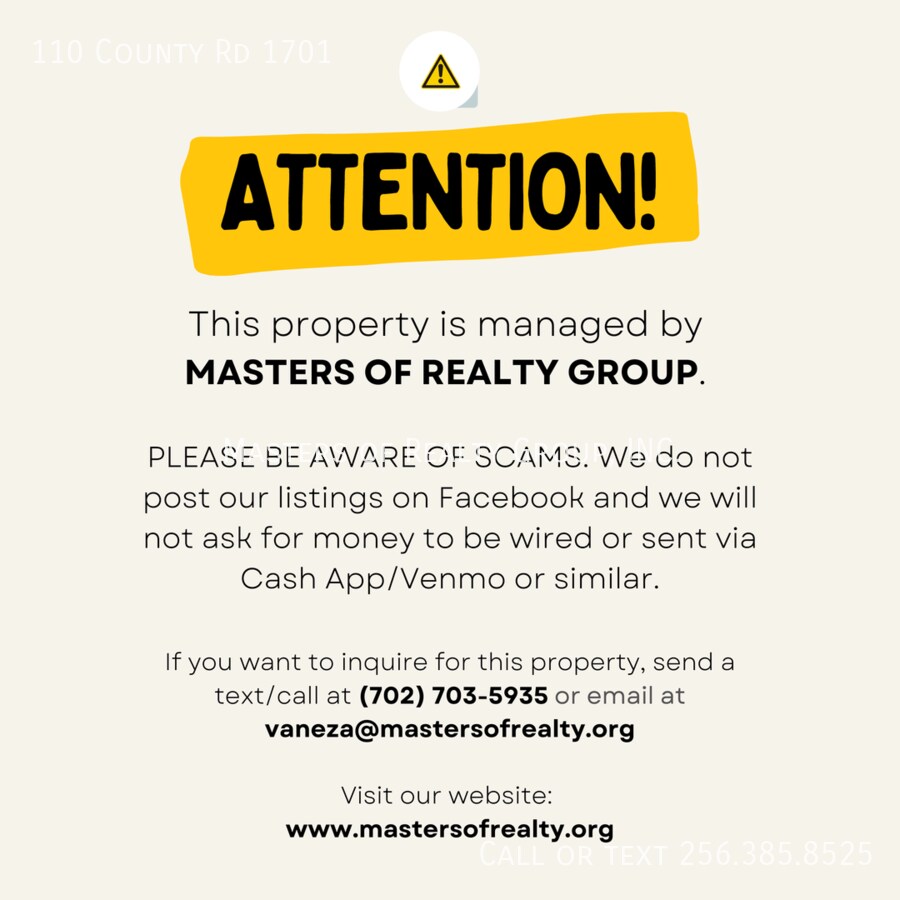 Stunning 3-Bedroom Home in Cullman, AL 35058. Available now! Home Features: * Master Suite - A nicely appointed retreat for ultimate comfort. * 2-Car Garage - Conveniently located on the main level. * Stylish Finishes - LVP flooring in main living areas, cozy carpet in bedrooms, painted cabinets, and * Quartz countertops throughout. * Stainless Steel Appliances - Includes dishwasher, freezer, microwave, range oven, refrigerator, and A/C. * Additional Perks - Double-pane windows, large closets, and an attached garage.. If you want to tour first, you can schedule a self-guided tour on ShowMojo through this link: Important Note: Only listings posted by Masters of Realty are legitimate. We will never ask for money to be wired or sent via Cash App/Venmo or similar.