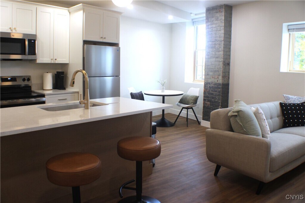 Coming into town and need a spacious,cozy 1 bedroom - queen bed,1 bath FURNISHED apartment in Baggs Square Downtown Utica district that is only 5 minutes from Wynn Hospital,Adirondack & Nexxus Center,minutes from thruway and train station? Walking distance to coffee shops,restaurants,entertainment,bike trails,and more! Apartment is furnished with kitchen and bathroom essentials,towels,bed linen,in-unit,laundry,smart TV,free parking in a beautiful,quiet downtown neighborhood. Large windows in every room provides natural light throughout the apartment. Climate controlled for everyone's comfort level. Includes all utilities,including free WiFi. Pet Friendly,non-refundable pet deposit and breed restriction applicable. Minimum 30 day to 12 MONTH LEASES AVAILABLE. Baggs Square Historical (5) Unit newly renovated spacious luxury Loft Apartments is located in the heart of Utica’s historic downtown area. These luxury,custom designed apartments all feature stainless steel appliances in eat in kitchens that have islands and custom lighting that adds a great finishing touch to the apartments that are loaded with natural light beaming through large windows with blinds and views of downtown Utica. There is free off-street parking around the back and a parking lot across the street. Two private entrances on each side; gorgeous lux remodel with art deco/mid century finishes with marble floor entryways and bathrooms. Each unit is uniquely designed with in-unit laundry. Encompassed with all of the historical features of exposed brick and tall ceilings. Don’t miss out on the opportunity to live in this stylish,modern apartments in Utica’s most desirable location. Minutes from Wynn Hospital,Nexxus Center,restaurants,coffee shops and entertainment.. Pet Friendly with a onetime nonrefundable deposit. The building is comprised of the following units: (2) One bedroom – 550 – 600 square feet (1) Two bedroom with 2 baths and walk-in closet – 1200 square feet (2) Two bedroom lofts with offices that could possibly be used as a third bedroom,2 bathrooms and possible third bedrooms – 1100 – 1350 square feet