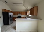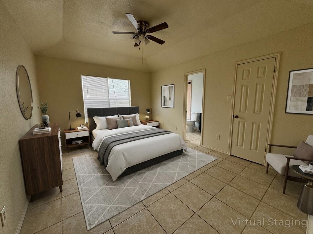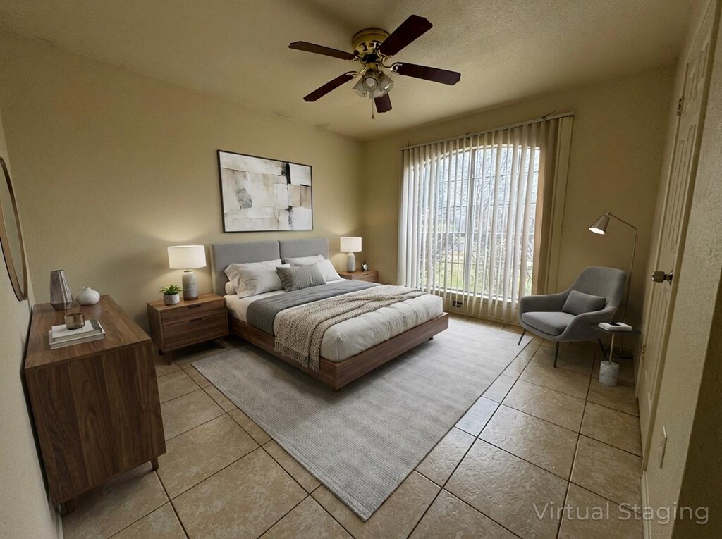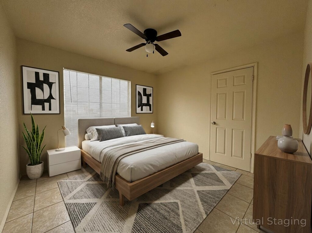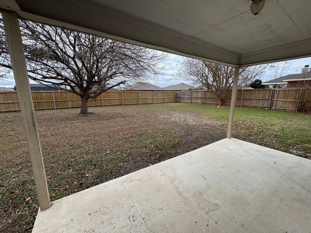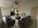 View 360 Virtual Tour: The living room features a wood burning fireplace and has plenty of space. The kitchen comes complete with electric appliances to include fridge, stove, double sink with disposal, dishwasher, and plenty of cabinet space. Amenities include ceiling fans in bedrooms, sprinkler system, large backyard, mature trees, and covered patio. Disclaimer: The furnishings or enhancements shown are AI-generated and intended for inspiration only. They may not reflect the actual scale, condition, or current features of the property.