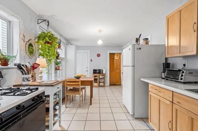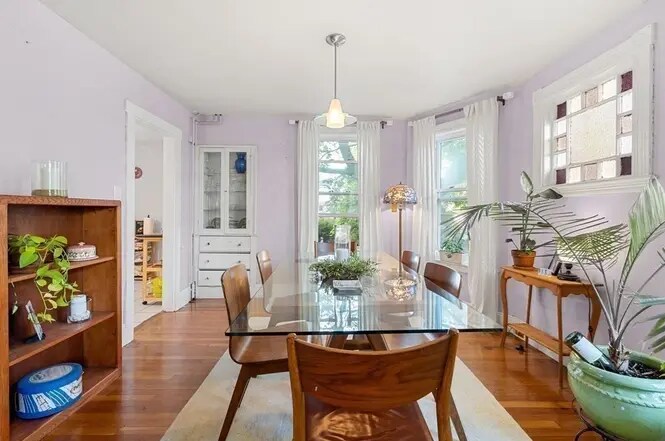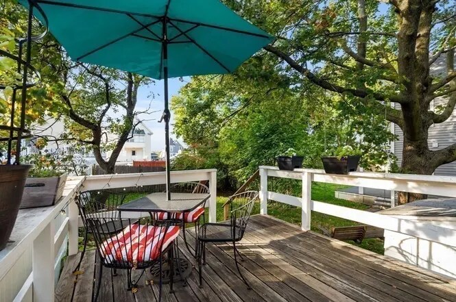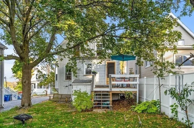 Single family home w/generous sized backyrd. Enter into a sunny 3 seasons porch w/natural exposed beams surrounded by windows & an abundance of sunshine. Next, a french door & elegant hallway leads to a fabulous living rm w/tall ceilings, hardwd flrs & a vintage bay window seat. A graceful dining room w/Queen Ann style stained glass window, built-in china cabinet, overhead modern lightng & hardwd flrs. The sunny eat-in kitchen offers lots of space for the creative chef w/pantry & prep area along w/separate laundry space. Walk up a classic staircase that has another lovely stained glass window & you will find two spacious bedrooms, separate office/study, 1/4 bath & views of the Mystic River. Beautiful backyard & deck ready for your entertaining. Updated electric, nwr windows, 8 yr oil tank & furnace & nwr hot water tank w/warranty 2029. Residential parking pass & permits.