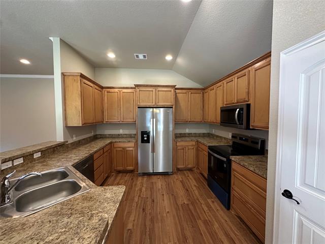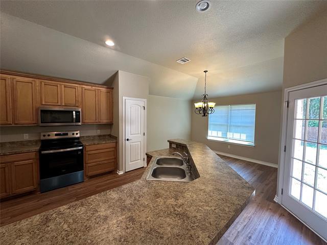 Freshly painted and So much Space! Open concept, crown molding, recessed lighting, and ceiling fans throughout, there is no carpet at all. The warm and inviting living room has natural lighting and plenty of room for entertaining. The kitchen has new stainless steel appliances, tons of cabinetry, lots of countertop space, pantry, along with a dining area that has a decorative chandelier and windows looking out to massive backyard. The primary is split from the others bedrooms, big enough for a sitting area. The en-suite duals sinks, separate tiled shower and deep soaking tub, and two walk in closets. The home is conveniently located near Chisholm Trail, schools, shopping and entertainment.