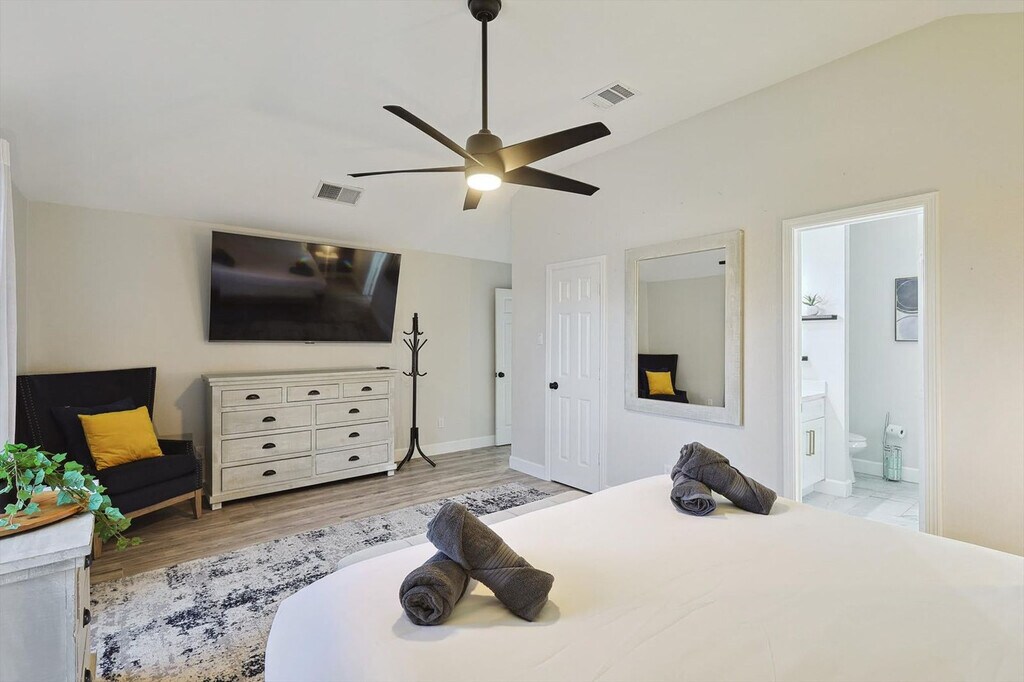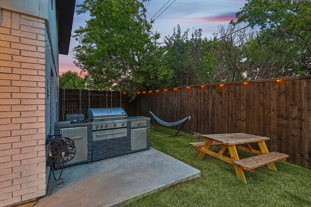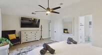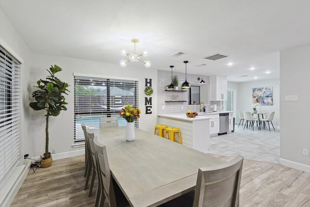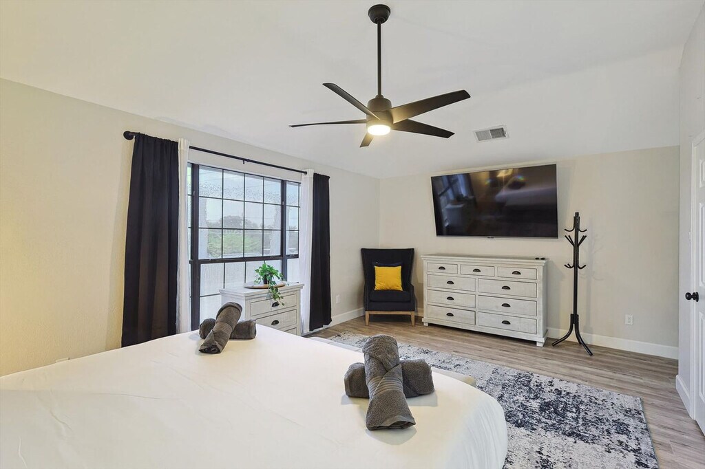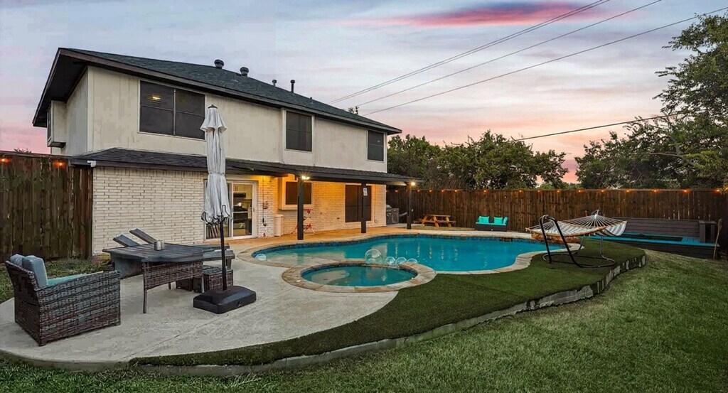 The advertised rate of $7,180/month is the lowest available price, based on a 1 month(s) stay with a move-in date of September 9, 2026. Rates vary depending on the duration of stay, season, and other parameters. For exact pricing and additional pricing components, please visit our website and enter your desired move-in and move-out dates. The rate is applicable when billed upfront; it can be higher if billed in multiple payments. Feel at home in this beautifully renovated home, located 26 miles from AT&T Stadium and just minutes from Lewisville Lake, parks, and trails. This home offers bright interiors designed for comfort and serves as a great North DFW base, offering relaxation, nature, and easy access to major attractions. Enjoy a private pool, fire pit, and BBQ area. The fully equipped kitchen makes cooking easy. Entertainment is provided by smart TVs with streaming apps. House-trained pets are welcome with a $150 fee per pet. From the seventh guest onwards, a $39 fee per guest per night applies. The fourth bedroom opens for groups of 6+ guests. This home is perfectly situated in a vibrant area with everything you need nearby. DFW International Airport is just 25 minutes away, and two grocery stores are only 4 minutes away. Lewisville Lake, just 6 minutes away, offers a variety of outdoor activities like water sports, golf, and swimming. Heritage Park is 7 minutes away, Grapevine Mills Mall and The River Walk at Central Park are 10 minutes away, Rheudasil Park is 5 minutes away, Twin Coves Park is 10 minutes away, Grapevine Vintage Railroad is 15 minutes away, and Six Flags Over Texas is 35 minutes away. Only registered guests are allowed. Quiet hours are from 10 p.m. to 9 a.m. Smoking indoors is strictly forbidden, and guests that break this house rule will receive a $500 penalty. The home's sleeping arrangements are as follows: Primary Bedroom: King Bed (2nd Floor) Bedroom 2: King Bed (2nd Floor) Bedroom 3: Queen Bed (2nd Floor) Bedroom 4: Twin-Over-Twin Bunk Bed + Twin-Over-Full Bunk Bed (2nd Floor) Bathroom 1: Full Bathroom Bathroom 2: Full Bathroom Bathroom 2.5: Half Bathroom [SI]