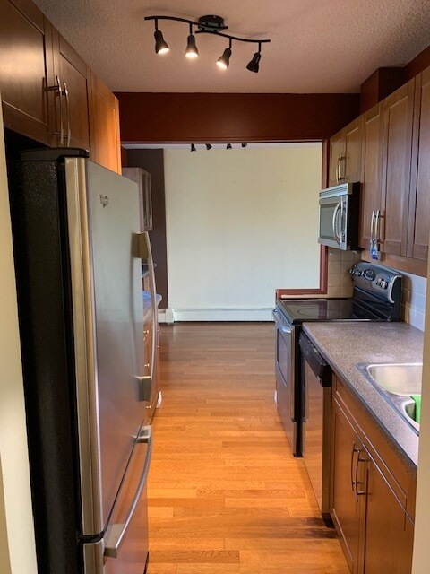 TOP unit. Great for professionals or university students. Very clean & quiet Incentives: ARLA member/good standing; fair & reliable Spacious, remodeled, 1,030 sq foot top floor, corner end unit in Garneau Place with a fantastic view. Very clean unit in this quiet concrete building. Walk to the U of A Hospital or campus, shopping, restaurants and just steps to the river valley. Immediate availability, if desired. This well laid out floor plan offers a lot of in-suite privacy. Primary bedroom with ensuite bath, as well as a full bath down the hall near a second bedroom. In suite washer-dryer, and SS appliances in the kitchen (including microwave). High quality washer/dryer in-suite. Abundance of cabinets and storage closet in-suite, as well as a second storage room off one of TWO balconies. Built in bookshelf and also an extra counter and storage cabinet in the dining area. Hardwood flooring throughout and tile in the bathrooms. Visitor parking on premises, and one heated underground parking stall also available to rent. Steps from University of Alberta Campus - 5-minute walk to University LRT Station - 4-minute walk to groceries at H-MART, 9-minute walk to groceries at Safeway - 10-minute walk to gym and pool at University of Alberta’s Hanson Fitness Center - 10-minute walk to Kinsmen Park Please only serious inquiries, and text or email only.