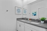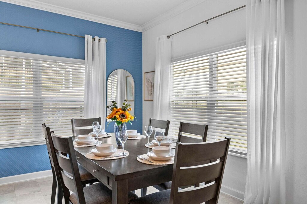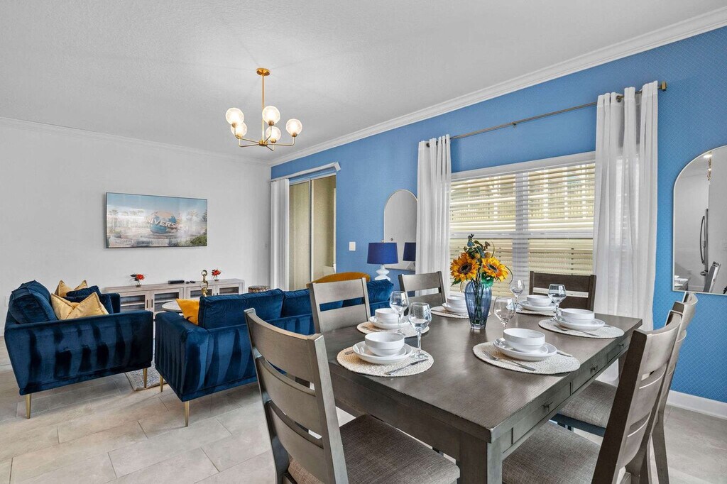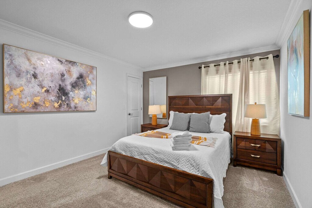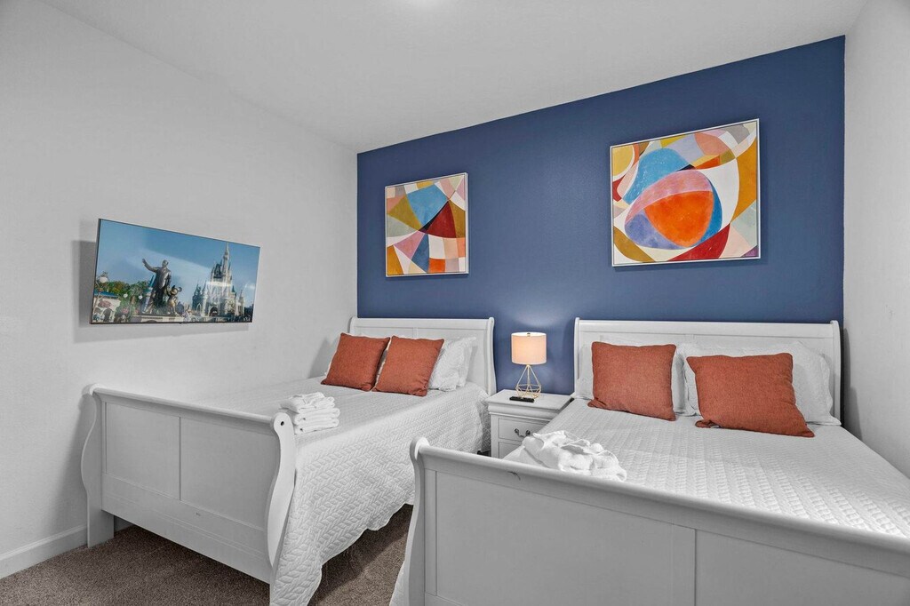 Experience comfort and style in this inviting 5-bedroom, 4-bathroom townhome located in Champions Gate Resort. Perfect for up to 14 guests, this home features a private pool and an Avengers-themed bedroom that kids and adults will adore. Enjoy access to the resort's clubhouse with pools, a lazy river, tennis courts, and a fitness center. Conveniently close to markets, restaurants, and shops, this is the ideal setting for your unforgettable vacation. Immerse yourself in the charm of this carefully crafted 5-bedroom, 4-bathroom townhome, designed for spaciousness and delightful comfort. The living room seamlessly merges with the dining area and fully equipped kitchen, creating a central space perfect for relaxation and culinary enjoyment. Step outside to your outdoor haven, where a private, heatable pool on the patio invites you to unwind and enjoy moments of tranquil leisure. The first floor features two bedrooms that share a bathroom: one with a queen bed and another with two double beds. Upstairs, you’ll find a queen bed suite, a king bedroom with an en-suite bathroom, and a fifth bedroom featuring an Avengers theme. This adventurous room boasts a bunk bed with a double and single bed, a single trundle bed, and its own bathroom. For added convenience, the home includes a laundry room with a washer and dryer, complimentary Wi-Fi, and free parking. A welcome kit with essential bathroom and kitchen amenities is thoughtfully provided. Heating the pool is a paid service and there is also a fee charged to use the barbecue grill. Champions Gate Resort is a resort-style community that offers every imaginable amenity for a blissful stay. It features an impressive clubhouse with a variety of courts and outdoor activities like tennis, beach volleyball, and a golf course, while its restaurant and fitness center will help you stay refreshed and fit. Its swimming pool complex is perfect for a splashy day, with slides, a lazy river, and a kids splash pool. Plus, the resort is just 20 minutes away from Disney Parks, ensuring plenty of opportunities for fun and adventure. Shopping, dining, and entertainment are also within reach, with stores, restaurants, and supermarkets nearby. It's the perfect place for a family getaway. Quiet hours are between 22:00 and 8:00. No smoking and pets are not allowed. Replenishment of bathroom and kitchen amenities is the guest's responsibility. [SI]
