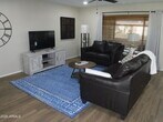 Available March 2026. King bed in the primary. Fully furnished rental home including dishes,linens and furniture. New tile shower,new tile floor,and faucets,new sinks,Sparkly White Quartz counters,new tile herringbone backsplash,new lighting inside and outside. new interior doors and hardware. New 50 inch LG TV in the living room. New paver patio in front and covered patio in back overlooking greenbelt and citrus trees. Flooring is wood look tile throughout and carpet in the bedrooms. AC new 2022,Bedrooms have King and Queen beds. Living room has leather sofa,loveseat and brand new swivel rocker. Sun City is the original Sun City with 7 Rec Centers and 8 golf courses. Attached garage is 1.5 spaces wide. First floor,no stairs,slider to grassy backyard and covered patio.