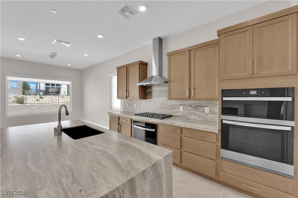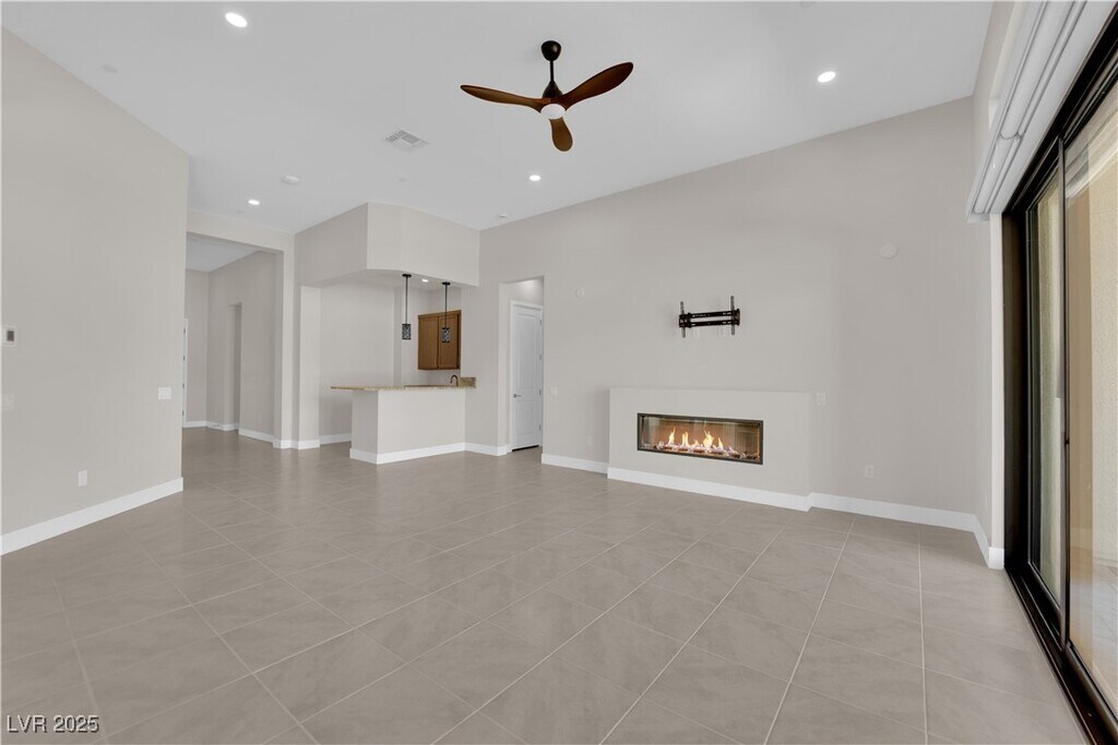BRAND NEW single-story home with 4 bedrooms plus a den in Summerlin! Located in Ascension, Summerlin’s newest guard-gated community near The Summit and Mesa Park, with nearby golf, scenic trails, shopping, dining, and entertainment. This home showcases a waterfall-style oversized kitchen island with stone countertops and backsplash, built-in stainless steel appliances, soaring vaulted ceilings, a fireplace, and ceiling fans throughout. Motorized shutters in the living room, dining area, and primary bedroom add comfort and privacy. The 10-ft collapsible sliding glass doors open to an 18x12 covered patio for seamless indoor/outdoor living. One of the four bedrooms is a private guest suite, offering flexibility for guests or multigenerational living. Future community amenities at Ascension will include resort-style pools and spas, pickleball courts, a state-of-the-art fitness center, golf simulator, and social venues.