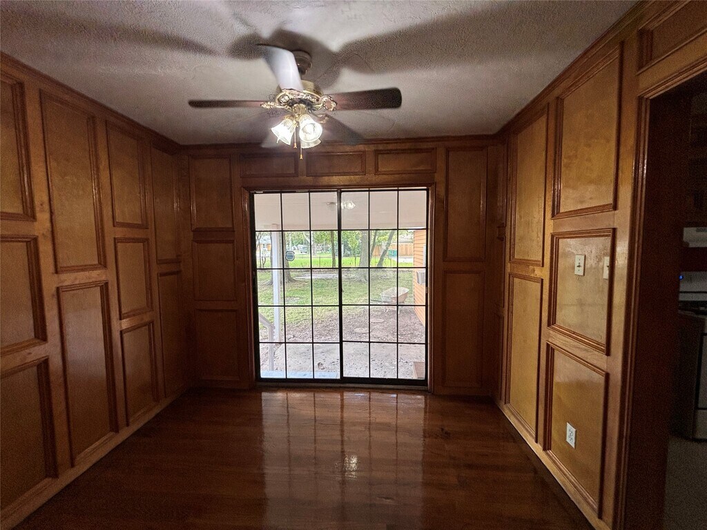 Gorgeous living room and family room with beautifully crafted blocked wood paneling and mirrors! You have two bedrooms and an extra room in the front home,then you have a bedroom suite with a full bathroom in the back of home. Large kitchen with a beautiful dining area with sliding glass doors leading to beck covered patio. Setting on a huge corner lot with fenced backyard. No animals allowed on property MLS# 74518038