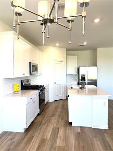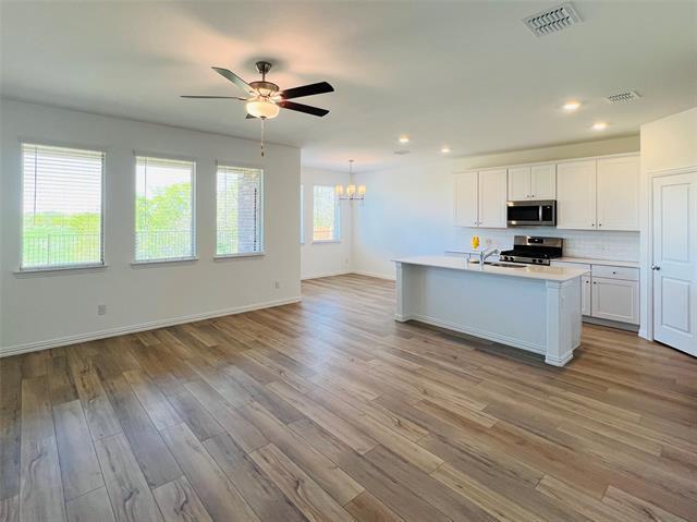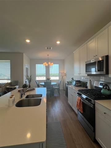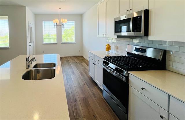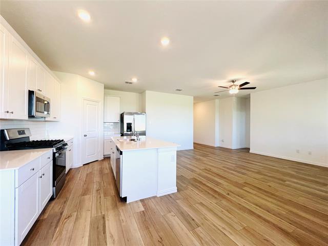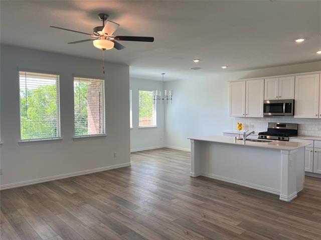 A modern home by a creek with tree and park view. This pretty new home located in a master planed community boosts a good size of 4 bedrooms and 2 full bathrooms. The open-concept main living area provides a modern kitchen with white cabinets and white quarts countertops, and Stainless Steel appliances including a double door refrigerator. Ceiling fans in every room. Pretty chandelier highlighted the dinning room. You can overlook the creek through the windows from dinning room, family room and primary bedroom. A covered patio is the ideal spot for outdoor relax time to watch the sunset in woods. Equipped motion detection security system Ring and sensors. Tenants enjoy excellent onsite amenities such as swimming pool and gym, club house, jogging or walking trails, greenbelts, ponds, dog park. Close to Golf club and easy to access highway 75, where shopping and dinning are nearby within 15 minutes driving.