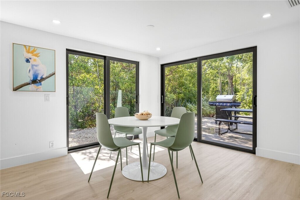 This 4-bedroom,3-bath residence has been completely reimagined with high-end finishes and smart design,blending modern comfort with coastal charm. Every detail shines—from quartz countertops and custom cabinetry to waterproof luxury vinyl plank flooring and impact-rated windows and doors. The open-concept kitchen,living,and dining areas create a bright,welcoming space perfect for entertaining or relaxing after a day at the beach. The home’s expanded layout includes a brand-new guest suite and a spacious ensuite primary bedroom,ideal for vacation rentals or multigenerational living. Outdoors,enjoy a newly built private boat dock with rope accents and power hookup,an elevated patio deck,and lush tropical landscaping complete with a rope-lined beach walkway. The location couldn’t be better—just a short stroll or bike ride to Lighthouse Beach,Wickie’s,and The Magic Bus,and with quick access on and off the island via the Sanibel Causeway.