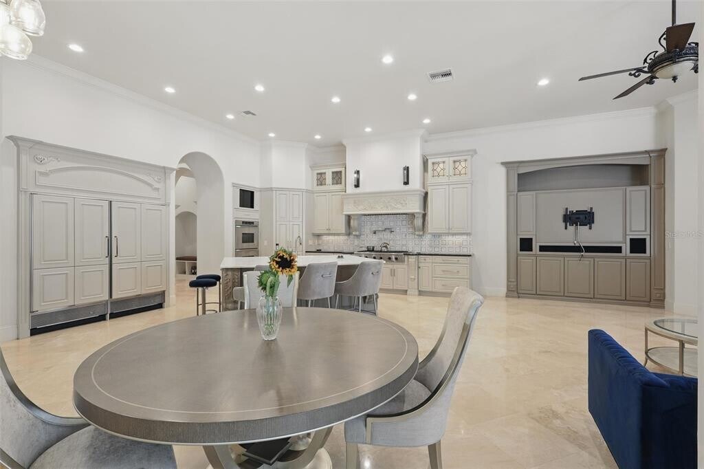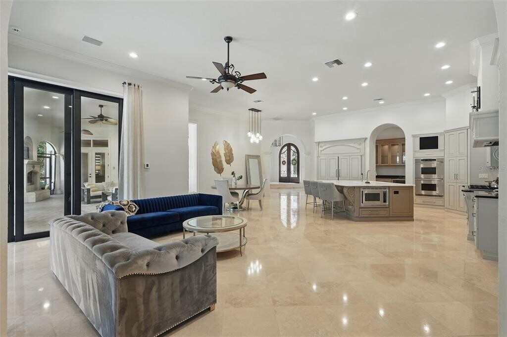 Highly sought after custom home in Reserve at Lake Butler Sound. Beautiful iron arched double doors welcome you to an open floor plan with travertine floors and a view to the pool/lanai. Wrought iron chandeliers adorn the entry and spacious dining area. Upgraded features are aplenty in this beautiful home including top-of-the-line appliances,2 gas fireplaces,and high ceilings. The large gourmet kitchen flows into the breakfast area family room with custom built entertainment wall and floor-to-ceiling 10' corner sliding glass doors that open fully to a large screened in porch complete with a fireplace and built-in outdoor kitchen. The kitchen has an enormous center island,Dacor and Sub Zero appliances including a 6-burner gas stove top,2 ovens,and a wet bar with wine fridge and warming drawer. There is also a spacious walk in pantry. The first floor has a game room with full bar,an office,and three bedrooms in addition to a large primary suite. The primary suite has hand-scraped wood floors,an oversized bathroom with dual vanities,a private courtyard,and a large walk in closet. Upstairs there is a bedroom,full bath,and a theater room with theater seating for 6,screen and projector. There is plenty of garage space with 3 garage bays,attic access and ample storage. The fenced backyard features a large pool with spa and water features. This home comes partially furnished with designer furnishings as shown in the photos. Close to shopping,dining,expressways,tourist attractions,top-rated public and private schools including Windermere Preparatory Academy. MLS# O6342459