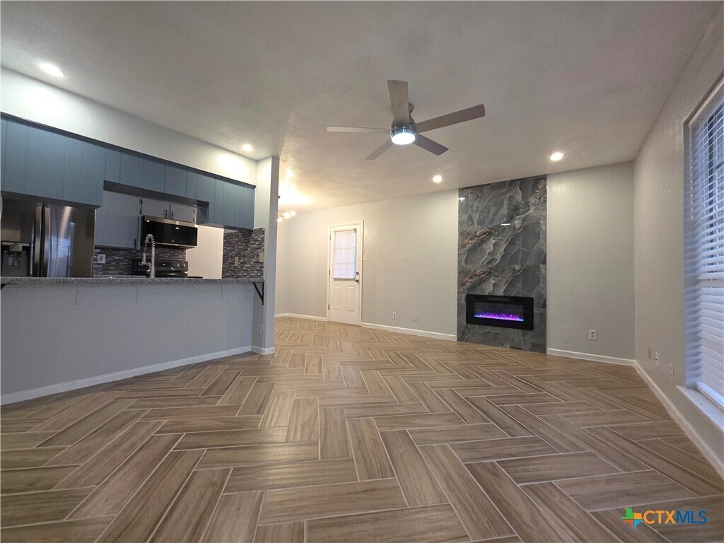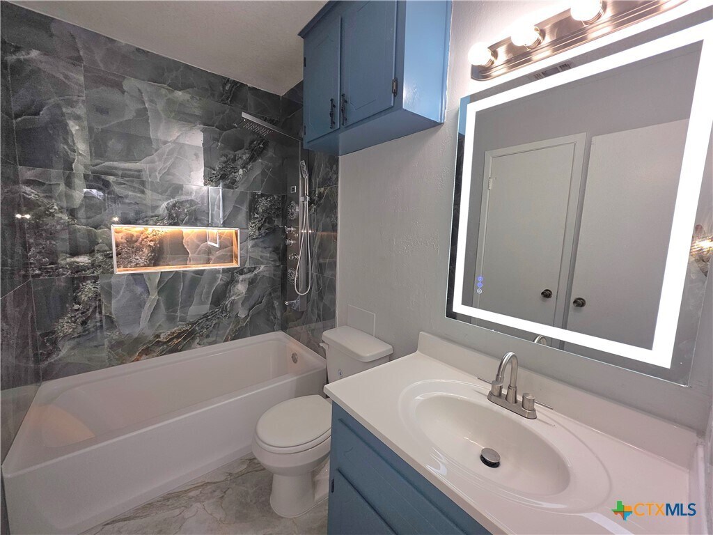 Beautifully remodeled townhome-style quadplex unit offering modern elegance and thoughtful design throughout. The stunning kitchen is equipped with stainless steel appliances,including a French door refrigerator,microwave,and stove,complemented by a large farmhouse sink with a commercial-grade sprayer faucet—perfect for both everyday living and entertaining. New tile flooring and fresh paint enhance the home’s clean,contemporary feel. The spa-like bathrooms provide a luxurious retreat,with the main bath featuring a lighted inset shampoo niche,marble tub surround,multi–body sprayer showerhead,and a lighted anti-fog mirror. The half bath includes a matching lighted mirror for a cohesive,upscale touch. All bedrooms are located upstairs,offering added privacy,and the primary bedroom opens to a charming private balcony. The expansive living area is highlighted by an elegant lighted electric fireplace with a floor to ceiling marble façade,creating a warm and inviting focal point. Step outside to enjoy a spacious back patio and cozy yard—ideal for relaxing or entertaining. This beautifully upgraded home seamlessly blends comfort,style,and functionality.