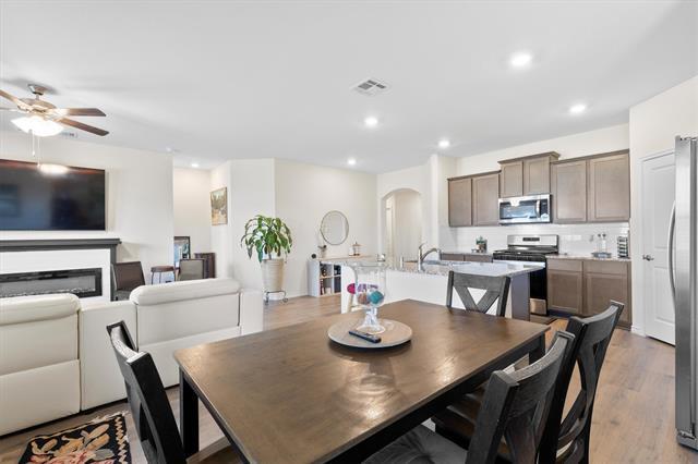 Move right in and relax in your like new home! Enjoy the open floor plan, spacious bedrooms, electric fireplace, large living room, and beautiful kitchen with stainless steel appliances, gas cooking and large island. The primary bedroom is separate from the other bedrooms and offers 2 sinks and walk-in closet. Enjoy quiet evenings on the covered back patio with plenty of space to play in the backyard. The refrigerator, washer and dryer stay. Walk to multiple neighborhood parks, neighborhood pool and the elementary school. Great home and community! Come see it soon!