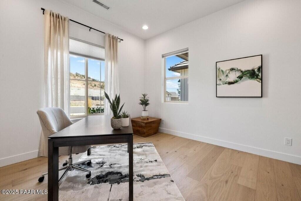Former Model Home,fully furnished with Model Home decor. Panoramic View Lot at the top of the development. Solstice Ridge II at Prescott Lakes. Over 100K in builder model home upgrades,has panoramic views of the golf course and mountain views. Professional landscaped,has 3Br,3Ba single level home with over 2,544 Sqft of living area. Has a walk out balcony great for entertaining,vaulted high ceilings,an open kitchen with large island bar,a dining area and large great room with fireplace. Kitchen has granite counters,upgraded stainless appliances,walk in pantry,and has custom luxury vinyl wood flooring throughout. Has a spacious master with large picture window with panoramic views,Maser Bathroom has a separate shower and soaking tub. Has a large 3 car garage,epoxy floor,cement tile roof and an indoor laundry with full size washer and dryer. Enjoy Prescott Lakes amenities,private golf course,clubhouse,pools and pickleball and fitness center.