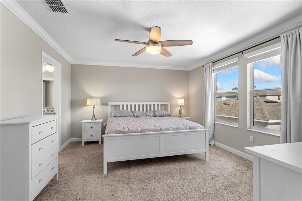 Beautifully-maintained 4-bedroom,3-bathroom home with a 2-car garage and spacious fenced patio. Great location in the desirable Storey Grove neighborhood of Horizon West (Winter Garden). Convenient to schools,new Publix shopping center,highways and minutes to Disney! Entering from the covered front porch,it makes a nice first impression with the wood-look tile plank floors,open floor plan,crown molding and modern fixtures. Recent updates include HVAC,Dishwasher,Exterior Paint and Electronic Thermostat. Notable features include a bedroom and full bath on the main floor,perfect for guests or in-laws,WiFi Mesh System,Smart Water Heater,and the fully fenced maintenance free back yard with a huge brick paver patio and newly-installed turf. The upstairs landing has a built-in desk and laundry room down the hall which includes a newer washer and dryer. The primary bedroom has a walk-in closet,en-suite bathroom with double sink and water closet. Additional 2 bedrooms share a bath with a double sink. The detached 2-car garage has a door opener and storage rack on the ceiling. Furniture is optional for an additional monthly fee. No pets please. MLS# O6375509