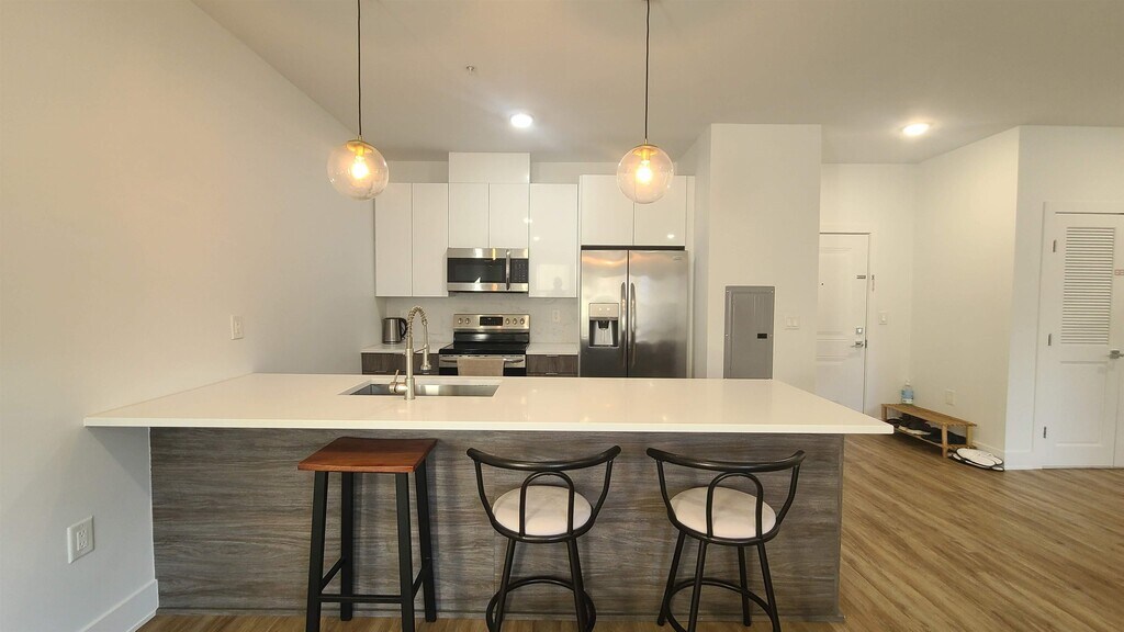 Welcome to this fabulous 1bd 1bth apartment located on the 2nd floor of a brand new construction elevator building. This beautiful home provides you with waterproof/scratch resistant wood looking floors throughout, luxury of in unit washer and dryer, tall ceilings, bright and airy with tall windows and ample closet space. Open layout modern kitchen features stunning countertops and stainless steel appliances. 1 Parking spot is available in the attached garage at $75/Month. Dogs under 50 lbs are welcome, sorry no Cats. All utilities are separate. Apartment is very quiet, no neighbors on either side, excellent transport to nyc, good natural light.