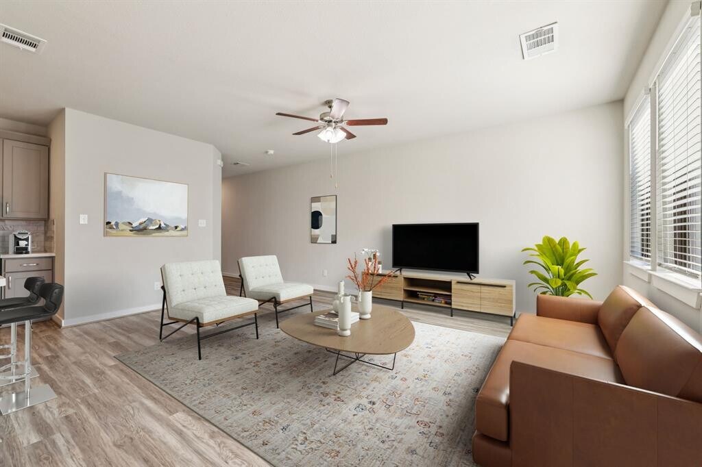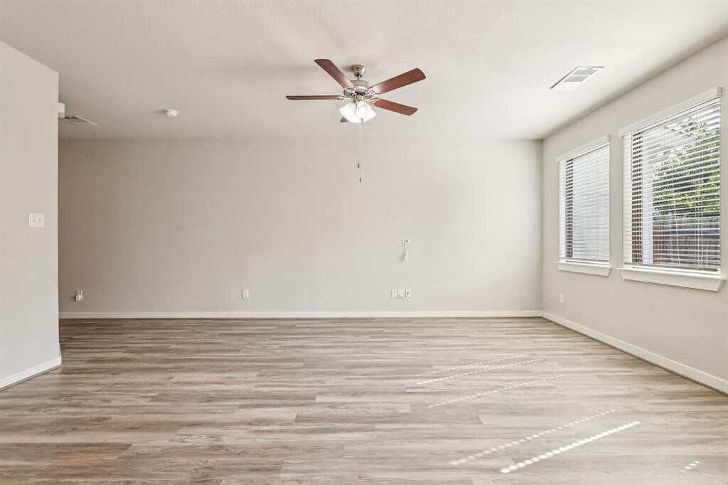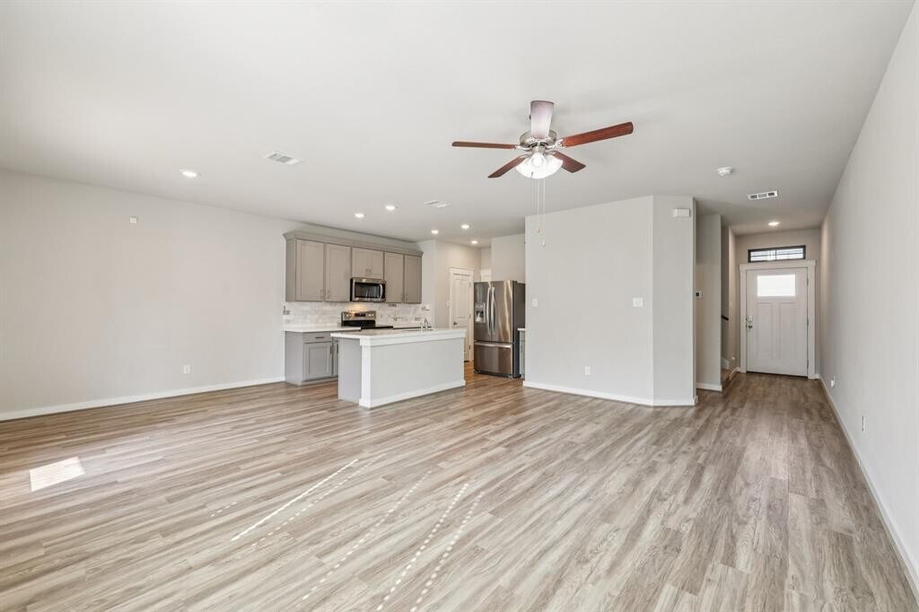 Beautiful, move-in ready, 2 story town home just 15 miles to downtown Austin! Newly updated with low maintenance turf grass and vinyl plank flooring - no carpet throughout! The 3 bedroom home features an open concept layout with kitchen and dining open to the living room. The kitchen includes, SS appliances, pantry, tile backsplash, recessed lighting and eat-in dining area. Refrigerator, washer & dryer included with lease! Laundry room & 1/2 guest bathroom on main level. Upstairs you will find the primary bedroom with bathroom en-suite that features dual vanities, walk in shower with subway tile surround, built-in shelves and walk-in closet. Plus a generously sized 2nd living area, 2 secondary bedrooms, and another full bath. Covered back patio with privacy fenced backyard and exit gate. Lawn care covered by HOA. Great community amenities including a pool with pavilion, playground, and dog park!