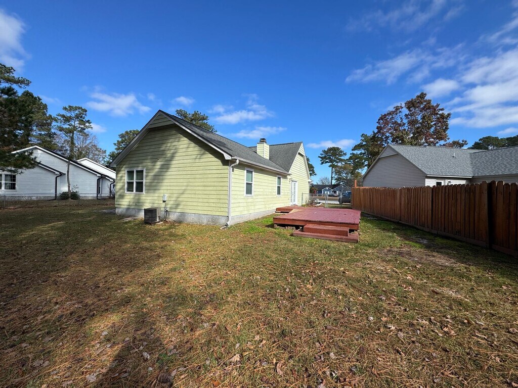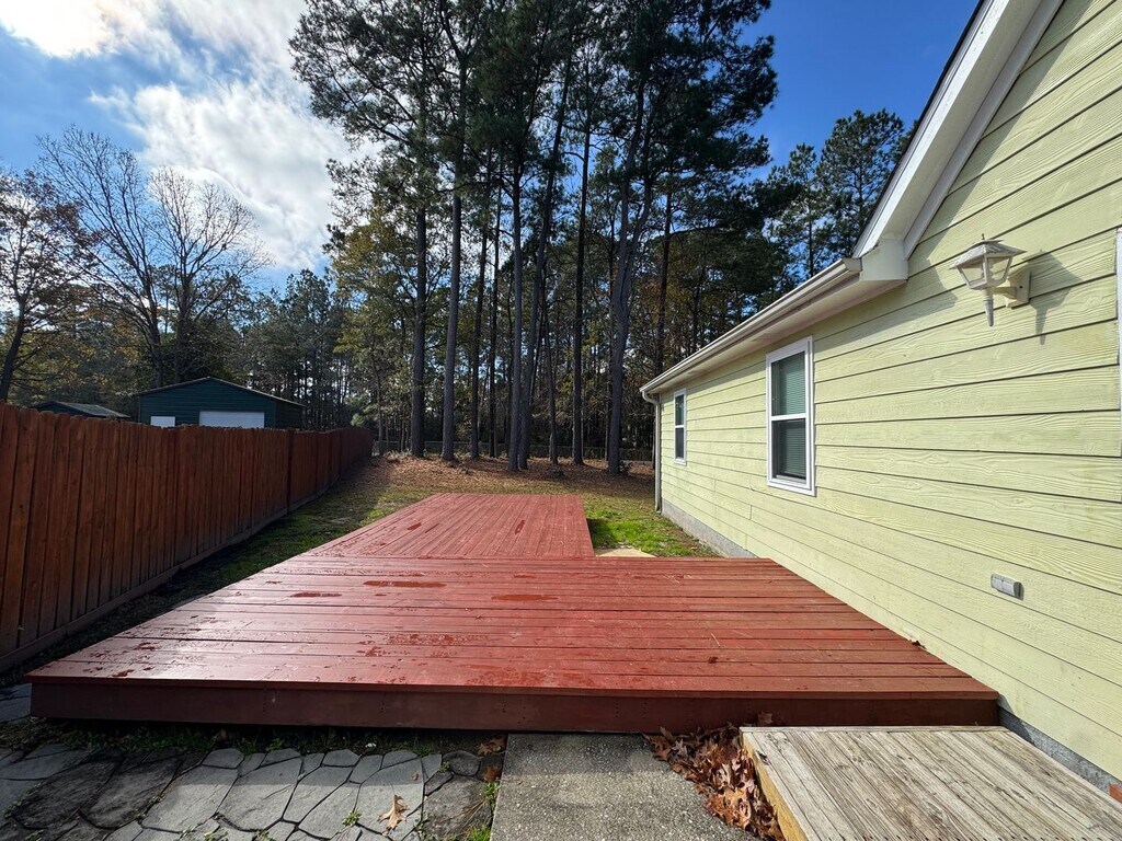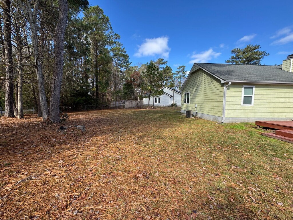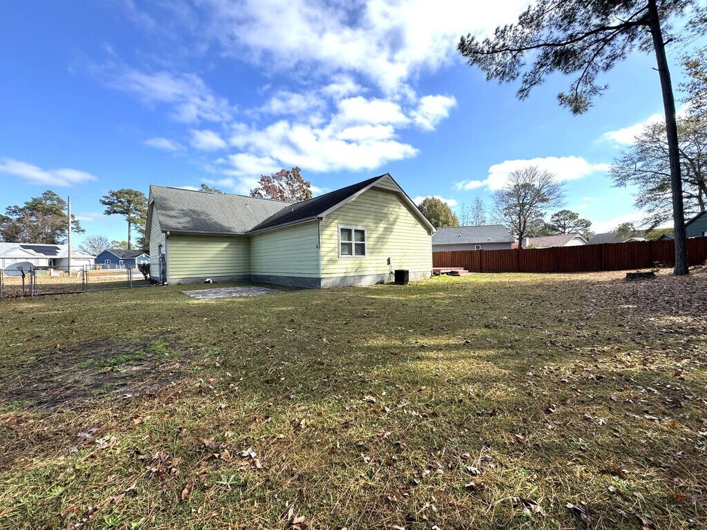 Adorable 3-bedroom, 2-bathroom home located in the desirable Hunters Creek area of Midway Park. This home boasts a spacious fenced yard, perfect for outdoor activities and pets, 2 with owner approval, $100 refundable pet deposit each along with $25 monthly fee each. The vaulted ceiling and wood burning fireplace adds a touch of elegance and spaciousness to the living area. The galley kitchen features a handy pantry for extra storage and bar access to the dining area. The home is carpet-free, featuring LVP flooring throughout, making cleaning a breeze. The home also offers a rear deck, perfect for relaxing or hosting barbecues. The property also includes a 1-car garage and includes a washer/dryer (as is). Conveniently located minutes from Camp Lejeune & shopping, this home is situated on a cul-de-sac homesite, offering a sense of community. This home is a perfect blend of comfort and convenience.