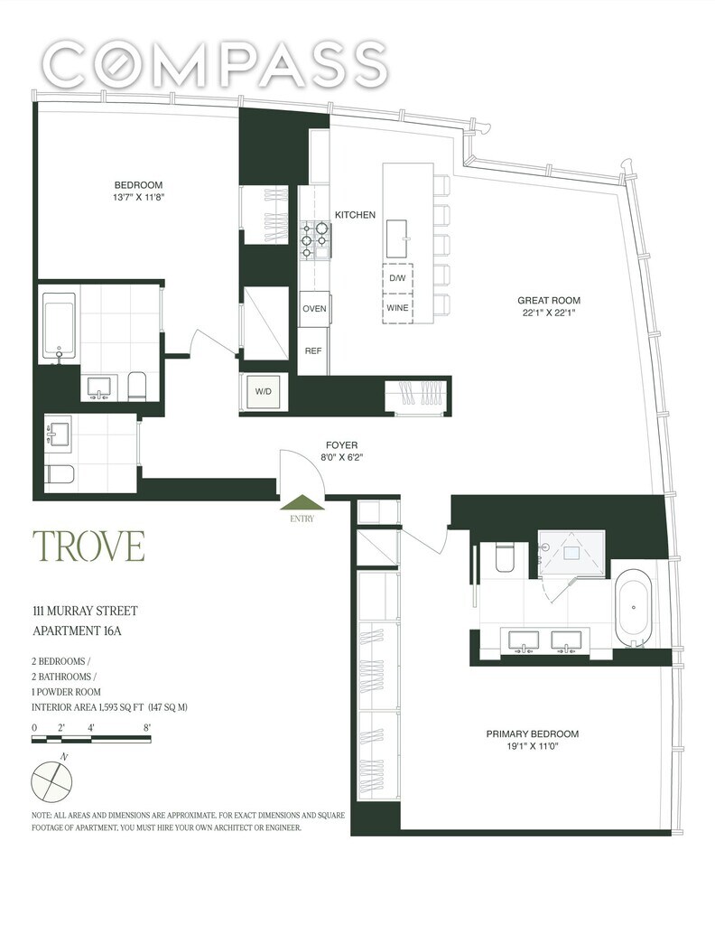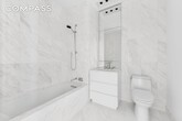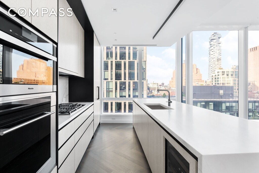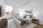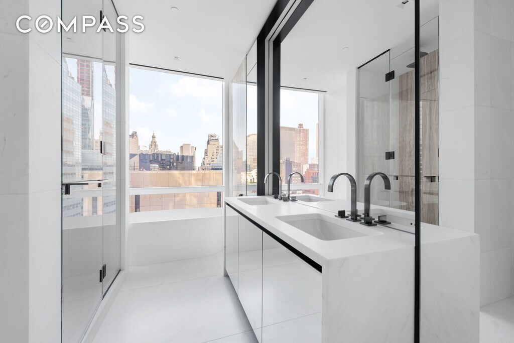 Spanning 1,593 square feet, this gracious split two-bedroom, two-and-a-half-bath residence offers exceptional scale, abundant natural light, and a high degree of privacy. A formal entry gallery leads into a dramatic 22-foot corner great room, where floor-to-ceiling glass frames serene views over Edmund Hollander–designed gardens and floods the space with southern and eastern light. The open chef’s kitchen, custom-designed by David Mann for Molteni, is both elegant and highly functional. White oak cabinetry is paired with Calacatta Borghini marble countertops and backsplash, Dornbracht fixtures, and a premium appliance suite by Wolf, Miele, and Sub-Zero—including a vented cooktop and wine refrigerator—making the space equally suited to everyday living and refined entertaining. The private primary suite occupies the southern wing of the home and serves as a tranquil retreat, featuring a spa-like bath with a freestanding BluStone soaking tub, radiant-heated floors, and a sculptural marble slab vanity. A well-proportioned second bedroom with en suite bath, a discreet powder room, and a utility closet with washer and dryer complete this thoughtfully designed residence. Developed by Fisher Brothers, Witkoff, and New Valley, 111 Murray Street is a striking Tribeca landmark designed by Kohn Pedersen Fox, with interiors by David Mann, landscape architecture by Edmund Hollander, and amenities curated by David Rockwell. Rising nearly 800 feet above downtown Manhattan, the tower is home to just 157 residences and over 20,000 square feet of resort-caliber amenities, including two swimming pools, a comprehensive fitness center, resident lounge, private dining spaces, landscaped gardens, and a wellness suite featuring a hammam, sauna, and treatment rooms—all set within one of Downtown Manhattan’s most coveted addresses.