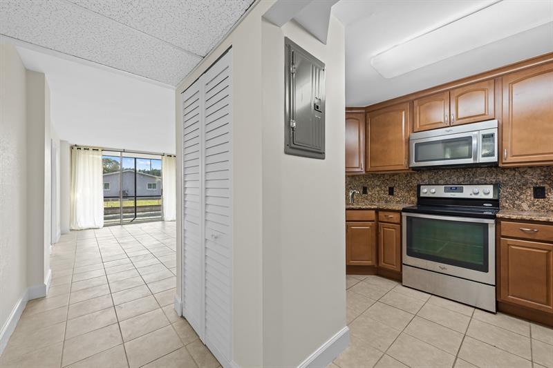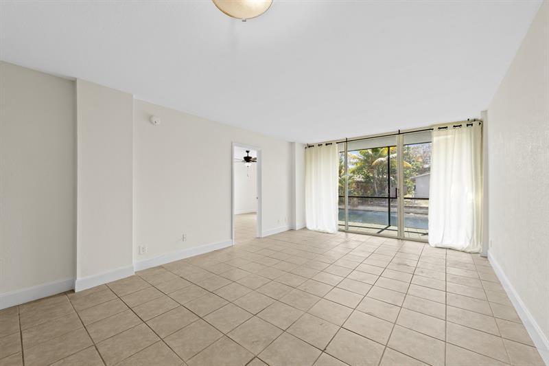 Excellent location for this 1st floor, well kept, condo. Open concept kitchen has stainless steel appliances, granite counters & wood cabinets. Neutral warm tile floors throughout. Completely screened in porch with peaceful water view. Hurricane Shutters. Very pet friendly. Guard gated community, multiple swimming pools, shuffleboard, clubhouse w/gym & saunas, BBQ areas & more. Royal Palm Park just across the street has walking/working out, picnics, kids park, tennis, pickleball, basketball, bocce courts, handball & 2 fishing lakes. Stunson Nature Trail is beautiful & relaxing to walk through. Easterlin Park has woods, trails, picnics & disc golf. Pet friendly-dog park close by. Wilton Manors, I-95 nearby. A wonderful location. Laundry just outside front door. Great place to call home!