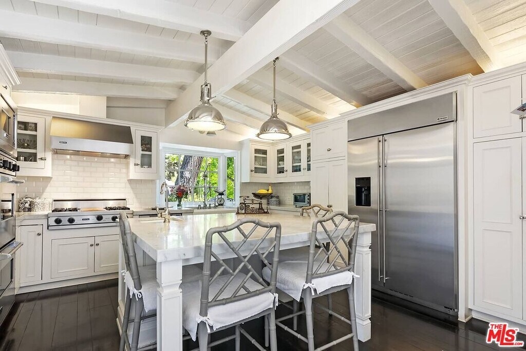 This exceptional 4-bedroom, 4-bath Westwood Hills Traditional is gracefully sited on an expansive double lot, blending classic 1930s charm with thoughtfully executed updates that honor the home's original architectural integrity. Instantly inviting, the property showcases storybook curb appeal with a welcoming brick porch, arbor, and classic white picket fence. Inside, rich hardwood floors run throughout, setting the stage for a formal entry that opens to a grand living room highlighted by a soaring vaulted, wood-beamed ceiling and a striking fireplace. The home is filled with warmth and character, complemented by distinctive ironwork and a stylish wet bar that enhances its timeless appeal. Across from the living room, the family room flows seamlessly into a beautifully appointed chef's kitchen featuring a wood-beamed ceiling, Carrara marbletopped island, farmhouse sink, and built-in breakfast nookperfect for everyday living and entertaining. A formal dining room adds to the home's gracious layout. A short set of steps leads to a cozy library or den, complete with the original corner brick fireplace, offering a perfect retreat. The en suite primary bedroom is a true sanctuary, featuring its own fireplace and a walk-in closet. Two additional bedrooms share a full bath, complemented by a powder room and a versatile bonus space ideal for a playroom, office, or study. Outdoors, the expansive backyard offers large, open grassy and patio areas designed for both relaxation and gatherings. Additional amenities include a separate en suite studio, laundry room, and a pool and spa. Ideally located within the highly sought-after Warner Avenue School District and just moments from UCLA and Westwood Village, this home offers a rare combination of character, space, and prime location. MLS# 25629191