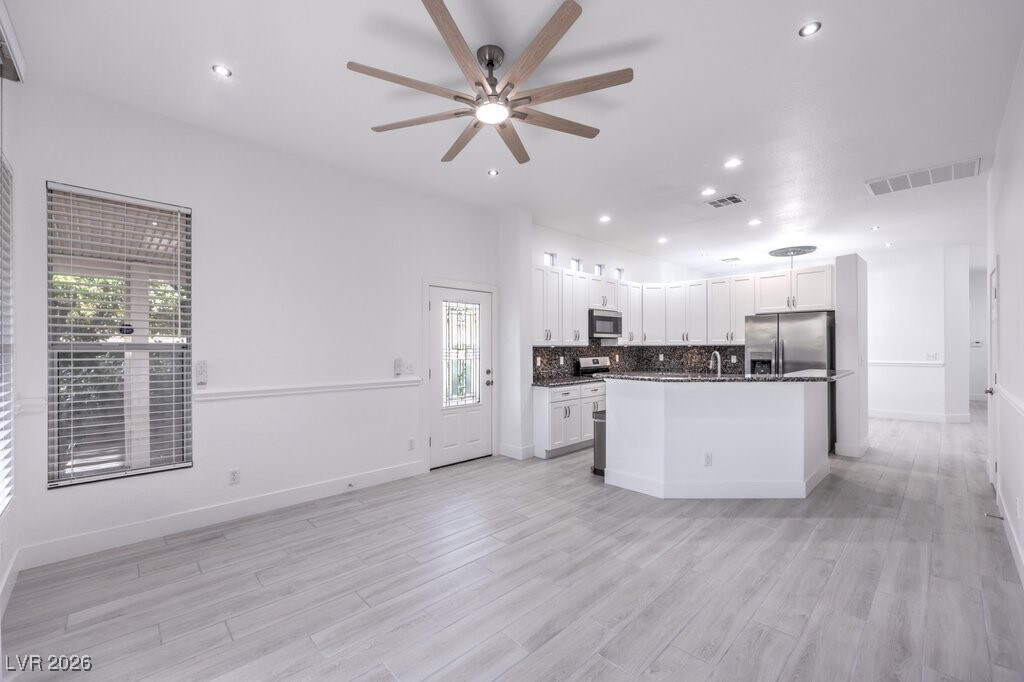 Beautifully renovated single-story corner unit located in a desirable gated community just minutes from the Las Vegas Strip. This clean and modern home features luxury vinyl flooring throughout, brand-new appliances, updated ceiling lights and fans, and an open, bright floor plan with excellent natural light. The epoxy-coated garage adds a polished, upscale touch rarely found in rental properties. Corner-unit location provides added privacy and curb appeal. Community offers resort-style amenities including pool, spa, clubhouse, and well-maintained grounds. Conveniently located near shopping, dining, entertainment, and major freeways. Move-in ready and meticulously maintained.