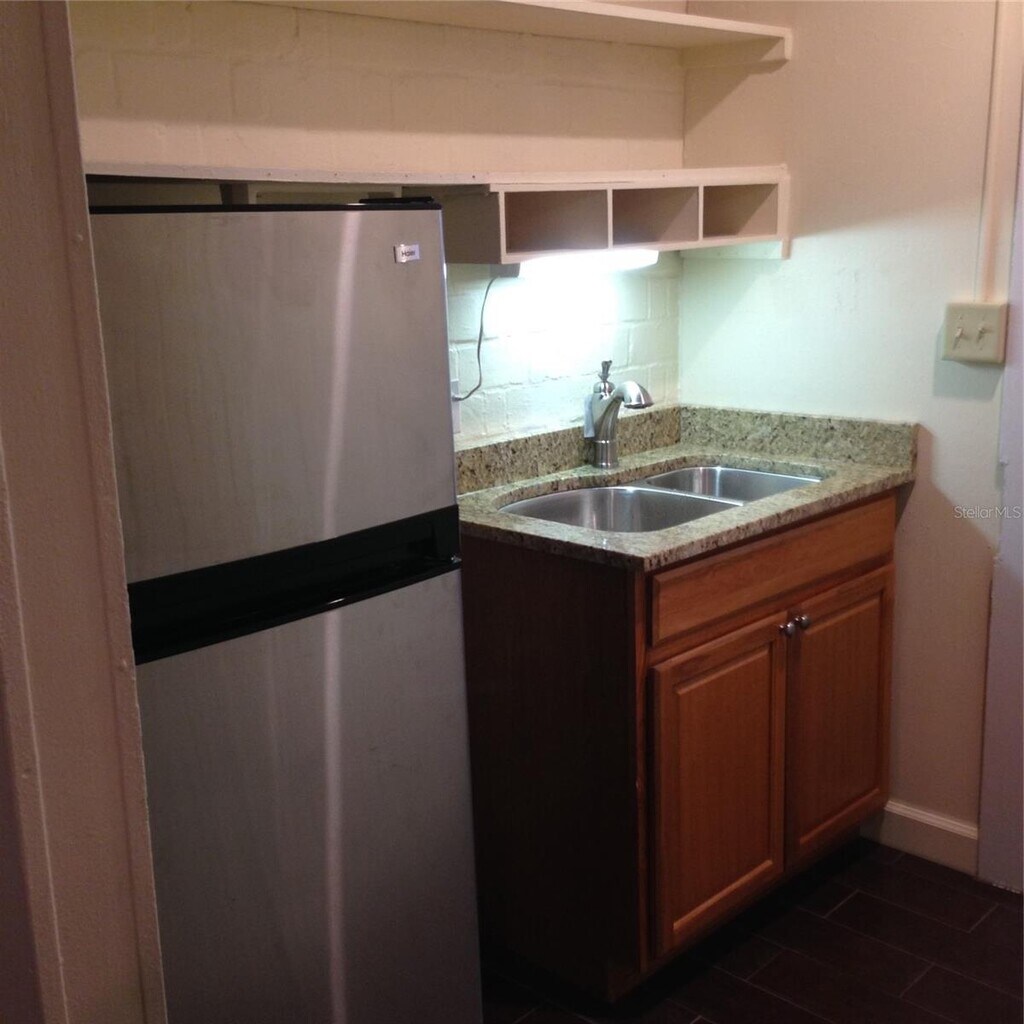 Conveniently located just blocks from the University of Florida and Sorority Row, this studio unit offers a smart layout with updated finishes throughout. The kitchen features granite countertops, a double sink, stainless steel appliances, and open shelving. The bathroom includes a fully tiled walk-in shower and modern vanity. This unit comes with ONE guaranteed parking spot Additional highlights include durable wood-look tile flooring, exposed brick accents, a window A/C unit, and ample natural light. This efficient space is ideal for anyone seeking a centrally located home with quick access to campus, dining, and entertainment.