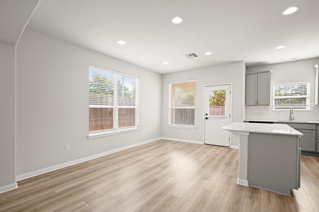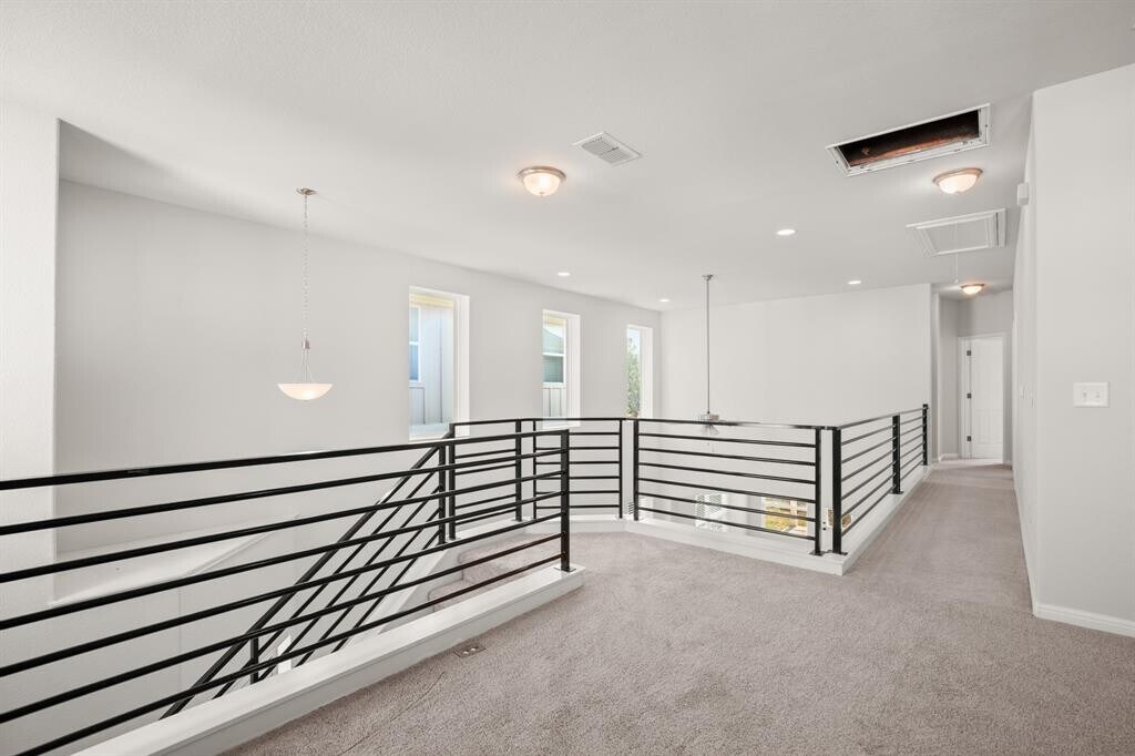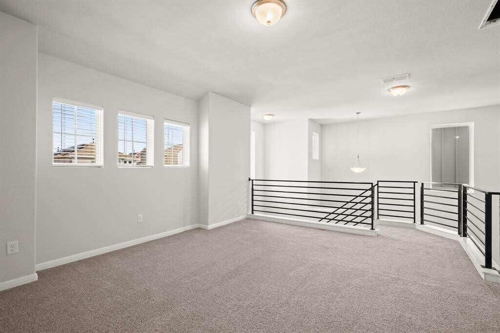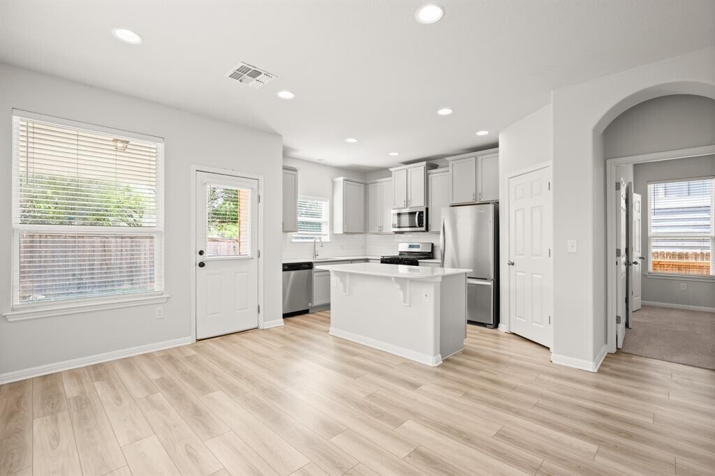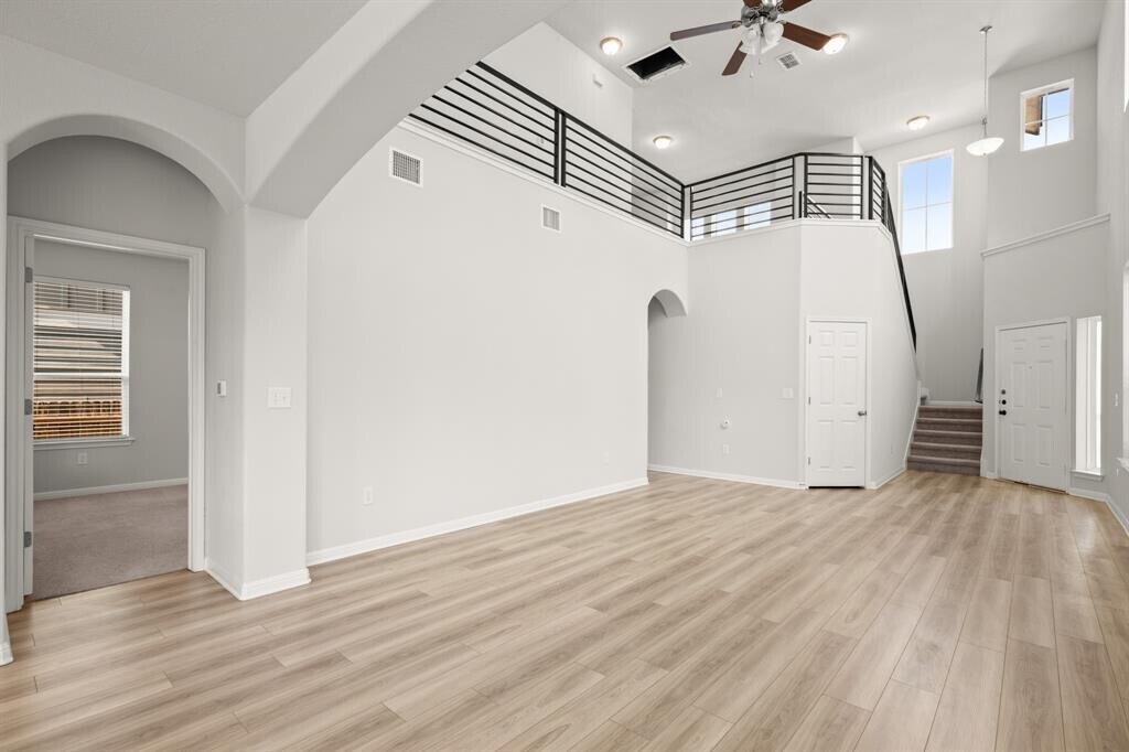 Beautiful 4 bedroom, 3.5 bath home in South Austin's Vistas. The spacious 2,273 square feet includes a second living area upstairs with a closet, plus the home has front and back porches and a backyard overlooking green space. Wood-look flooring and vaulted ceilings highlight the main living area, along with a modern staircase railing and arched walls for added style. The kitchen features a large island with a seating area plus a roomy pantry. The primary bedroom is oversized, and the en suite includes double vanities and a walk-in closet. Enjoy the neighborhood pool and playground! Recent interior paint.