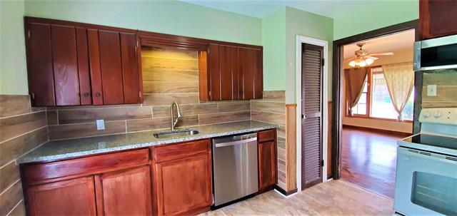Nice 3 Bed 2 Bath home 2 blocks from UNT. 2nd bathroom features sitting height, power flush toilet & a frameless glass corner shower. Lux vanity & abundant lighting. Renovated Kitchen with New Wood Cabinets, Granite Counters, Deep Stainless Steel Sink with Delta Gooseneck Faucet, Frig & Dishwasher, Lux Vinyl Tile flooring. French doors w built in blinds open to the beautiful back yard. Bedrooms are split for added privacy. Central Gas Heat & Air. Refinished Original hardwood floors in the living & dining area as well as 2 bedrooms. Living room features Huge picture window. Utility room with washer & dryer. Private back yard is great for pets. Students ok. Pets ok. No Sec8. Occupied. Available 2-1-2026. Stock Photos.