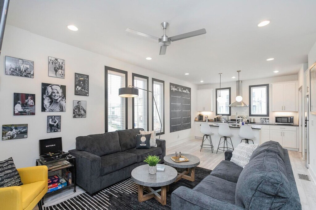 Escape to this Nashville retreat just 2.6 miles from downtown, offering an unforgettable experience with custom murals. This end unit provides privacy, while the 3rd-floor bedrooms feature en-suite bathrooms, TVs, and sitting balconies. Relax in the spacious living room, dining area, and fully equipped kitchen, all designed for your comfort and convenience. Indulge in the ultimate Nashville getaway at this charming retreat, strategically located just 2.6 miles from the vibrant heart of downtown. Enjoy curated music lists for Nashville's greatest, accessible through QR codes on the pictures. The entrance has no stairs, but there is a set of stairs up to the main level. The sleeping arrangements include a king bed and smart TV in Bedroom 1, a built-in queen bunk bed that can sleep four adults and a smart TV in Bedroom 2, and a queen-size pull-out sofa with a smart TV and fireplace in the living room. The apartment features an open chef-style kitchen with stainless steel appliances, marble countertops, high-end finishes, a fireplace, two full baths in each bedroom, a half bath on the living floor, and a washer/dryer. A classic drip coffee maker is provided with the first round of whole beans, sugar, and mini moo creamers. The property is a 5-10 minute Uber/Lyft ride to Broadway and Nissan Stadium, depending on traffic. The property includes a two-car garage, and there is a nearby parking garage for extra parking, which requires an online reservation. Perfectly situated in a quiet location, yet super close to all the action, you're minutes away from Nashville's Top Golf, numerous great restaurants in East Nashville and Germantown, and just minutes from downtown Broadway. Catch a game at Nissan Stadium, a concert at The Ryman or Bridgestone Arena, or bring the kids to the Adventure Science Center. You're close to it all! Quiet hours are in place to respect neighbors by keeping outdoor noise levels down. Smoking is not allowed inside or within 25 feet of the property, with a $500 fee if smoke is detected indoors. Early check-ins or late check-outs must be pre-arranged, with a fee of half the nightly rate if available. Please ensure all doors are shut and locked when not in use, and do not leave valuables in your vehicle if parked on the street. The primary guest must be 21 years or older, and photo ID information must match the credit card used. Registration Number: [SI]