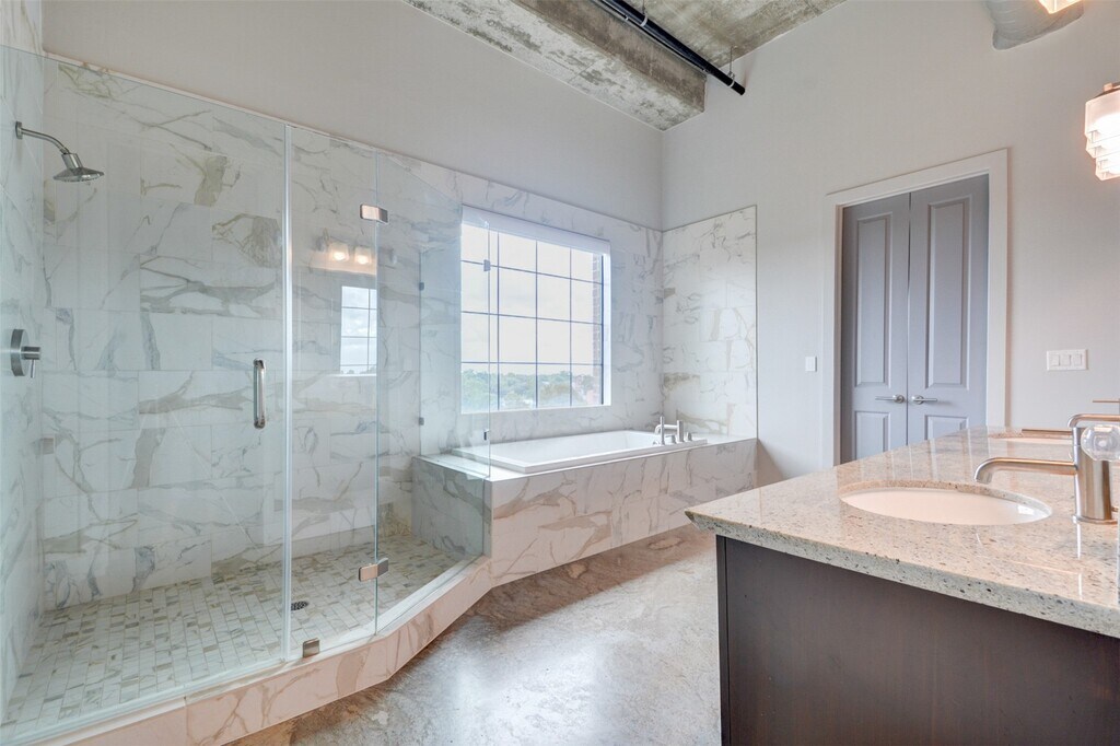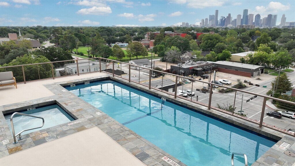 What a Rare Find. Fifth Floor Condo in a fabulous Houston Heights location. 180 degree view of downtown,rooftop pool and entertaining space including grills and fire pits. Condo has 14ft ceilings,urban vibe with concrete floors and luxury throughout. Primary Suite has soaking tub,large walk in shower and large closet with ample storage. Secondary Bedroom has included bathroom,stand up shower and large closet. Gourmet kitchen with top of the range appliances open concept to living area and more views of downtown. Washer,dryer and refrigerator included. 2 Parking spaces included. Don't delay this is a rare find in the heart of Houston. Call today for a personal showing and Welcome Home! MLS# 46643228