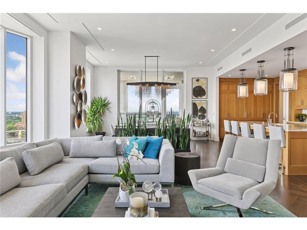 Perched on the desirable northwest corner of ELEVEN, Minneapolis' premier luxury condominium tower, this meticulously crafted two-bedroom plus library, three-bath residence offers an unrivaled vantage point over the Mississippi River, downtown skyline, Gold Medal Park, and the iconic Stone Arch Bridge. The sweeping views rank among the most breathtaking in the city. Designed with timeless sophistication, the home features expansive floor-to-ceiling windows that bathe each room in natural light. The open concept living area is anchored by a show stopping chef's kitchen adorned with white oak cabinetry, marble countertops, Wolf and Sub-Zero appliances, and an oversized island perfect for casual gatherings or grand entertaining. The adjacent dining area offers captivating views to the west and north, while the great room invites relaxation with a gas fireplace and custom build-ins. The serene primary suite is a true retreat, complete with a spa-style marble bathroom, deep soaking tub, walk in shower, radiant heated floors, and a luxurious closet. Step outside onto the 195-square-foot heated and covered terrace-your front-row seat to Minneapolis' ever-changing riverfront. A well-appointed second bedroom with ensuite bath, built-in desk, elegant powder room, and laundry, round out this thoughtfully designed home. Finishes include ten-foot ceilings, oak flooring, enameled woodwork, integrated Sono's speakers, Lutron lighting, eight-foot paneled doors, and three heated garage spaces. ELEVEN redefines luxury urban living with exceptional amenities: 24/7 concierge and doorman, private motor court, board room, resident library, state-of-the-art fitness and yoga studios, steam and sauna rooms, golf simulator lounge, club room with chef's display kitchen, 75-foot lap pool, hot tub, outdoor kitchens and fire features, sport court, private dog park, car wash, and EV charging stations. Moments from the city's best dining, trails, parks, and theaters, this condo offers and unparalleled lifestyle in the heart of Minneapolis.