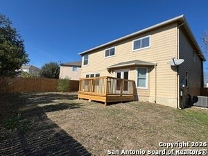 Spacious 3 bed, 2.5 bath home conveniently located in the Laurel Mountain community within minutes of multiple popular shopping and dining destinations and Lackland AFB. Xeriscaping in the front yard offers an attractive entrance and added benefit of little-to-no maintenance. Enter into an inviting open floor plan perfect for entertaining with a large family room and kitchen, and French doors opening out onto an oversized deck. Vinyl plank flooring throughout the downstairs makes for easy clean-up. Continue upstairs to find a second family area and bedrooms. Primary bedroom features an ensuite bathroom with a double sink vanity, separate shower and garden tub, and a sizeable walk-in closet with built in shelving. Community amenities include a pool, walking trails and a park.Home & carpets have been recently cleaned. Kindly remove shoes when touring.