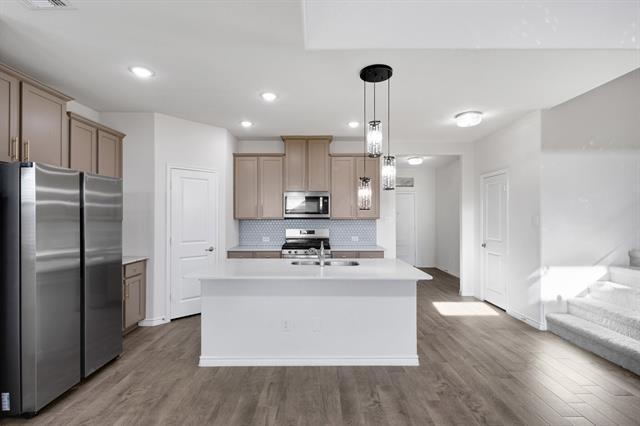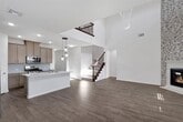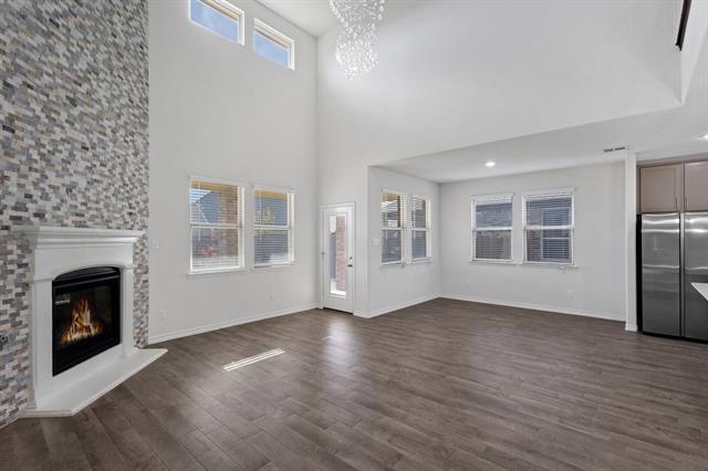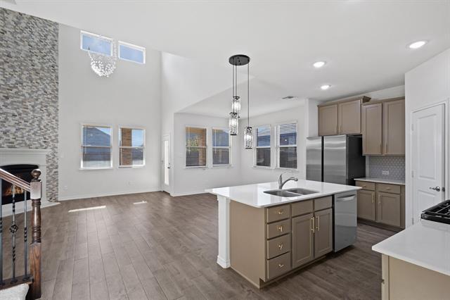 Available for immediate move-in! Meticulously maintained and upgraded - this home shows and feels brand new!!! BRAND NEW SIDE BY SIDE STAINLESS STEEL FRIDGE INCLUDED! PLUSH BRAND NEW CARPET THROUGHOUT THE HOME! Take advantage of the many wonderful amenities in the Silverado West Community, and all of the upgrades that this magnificent home has to offer! The four bedroom, 3 full bath floorplan is perfect not only for practical & comfortable living, but is also a show stopper with the open-to-below living area, upgraded light fixtures & hardware, and the two story tall ledger stone fireplace! Gorgeous wood-look tile floors throughout main living areas are a breeze to maintain, yet very durable. Master suite, and an additional secondary bedroom with a full bath conveniently located downstairs. Spacious game room, and two large sized secondary bedrooms privately located upstairs. Kitchen features shaker cabinets with designer paint, luxe cabinetry hardware, stainless steel appliances, and an attractive granite countertop-tiled backsplash combo! Large covered patio and the manicured greenspace in the backyard are perfect for outdoor enjoyment!
