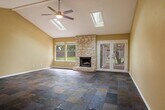 Gorgeous one-story home in the highly sought-after Barrington Oaks community! This immaculate home is situated on a large lot with mature trees and beautiful landscaping. It features an ideal, open-concept layout. The kitchen, which opens up to the living area, boasts a tiled backsplash, a large peninsula island, and stainless steel appliances. The living area is breathtaking and perfect for entertaining. With an impressive stone fireplace and a vaulted ceiling, tons of natural light is provided by large windows, skylights, and glass french doors to the backyard. The formal dining room is the perfect setting for large gatherings or it could also make a great office. The primary bedroom is spacious and the luxurious primary bath features dual vanities and a gorgeous shower. There is no carpet in the home and all rooms have ceiling fans. The backyard is truly a private oasis. Enjoy quiet evenings on the covered and screened-in back patio or entertaining friends around the picturesque fire pit via the illuminated stone paver pathway.