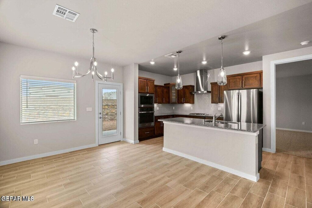AVAILABLE NOW! Beautiful and move-in ready,this 3-bedroom,2-bathroom modern home is located just minutes from Fort Bliss and offers easy access to the main highway. Featuring high ceilings and an open-concept layout,the home feels bright and spacious with large windows filling the living space with natural light. The stylish kitchen boasts stainless steel appliances and a breakfast bar,while the master suite includes an en-suite bathroom and walk-in closet. Schedule your showing today! HVAC benefit package included. Renter's insurance required. Pet-friendly with $250 pet deposit and $30 pet rent per pet.