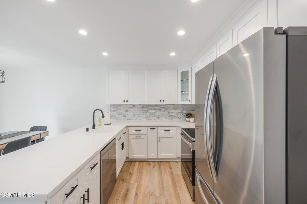 This beautifully reimagined single-story townhome in the heart of Westlake Village has been thoughtfully remodeled from top to bottom, offering effortless living in a private, secure setting. The 2-bedroom, 2-bath residence with 2 car garage is completely move-in ready & updated with wide-plank wood flooring throughout for comfort, convenience & style. The elegant kitchen features custom newer cabinetry with soft-close drawers, quartz countertops & updated appliances, creating a welcoming space for both everyday living & entertaining. Generous living room/dining area, highlighted a cozy fireplace that adds warmth & character. Both bathrooms have been tastefully upgraded, including a spacious walk-in shower in the primary suite, with mirror closet doors which has been reconfigured to maximize privacy. Sliding doors open to a tranquil, private patio with newer pavers--an ideal spot for morning coffee or evening relaxation. With no interior steps and a direct path to the detached two-car garage, this home supports easy, low-maintenance living. Additional features include in-garage laundry, ample storage, & convenient guest parking nearby. Water & trash service are included, & residents enjoy access to a community pool, peaceful tree-lined pathways & near Westlake Lake. Ideally located close to Westlake Plaza, Stonehaus, restaurants, shopping, parks & hiking trails, this Village Glen home offers a refined lifestyle in one of Westlake Village's most desirable communities. Move right in!